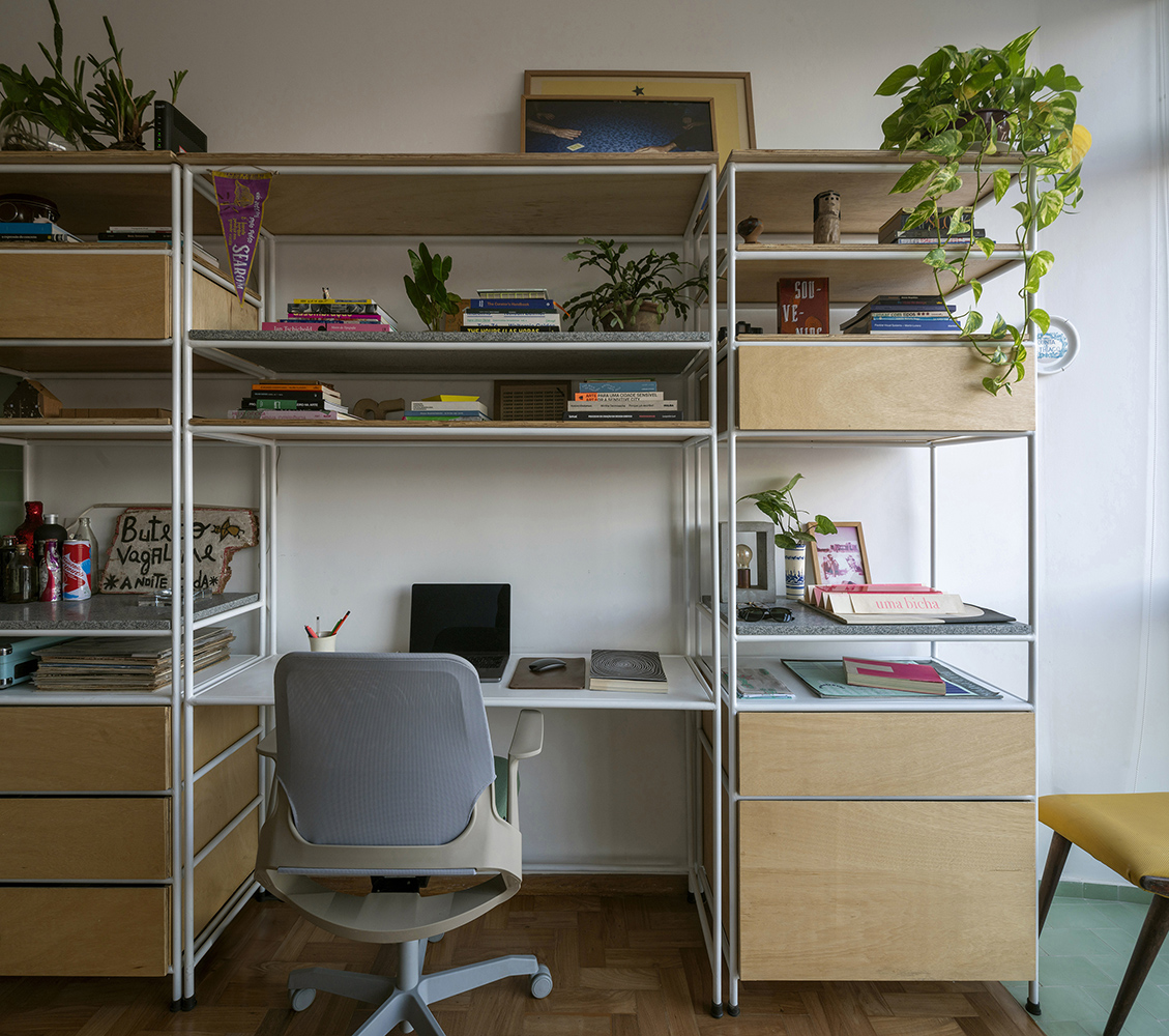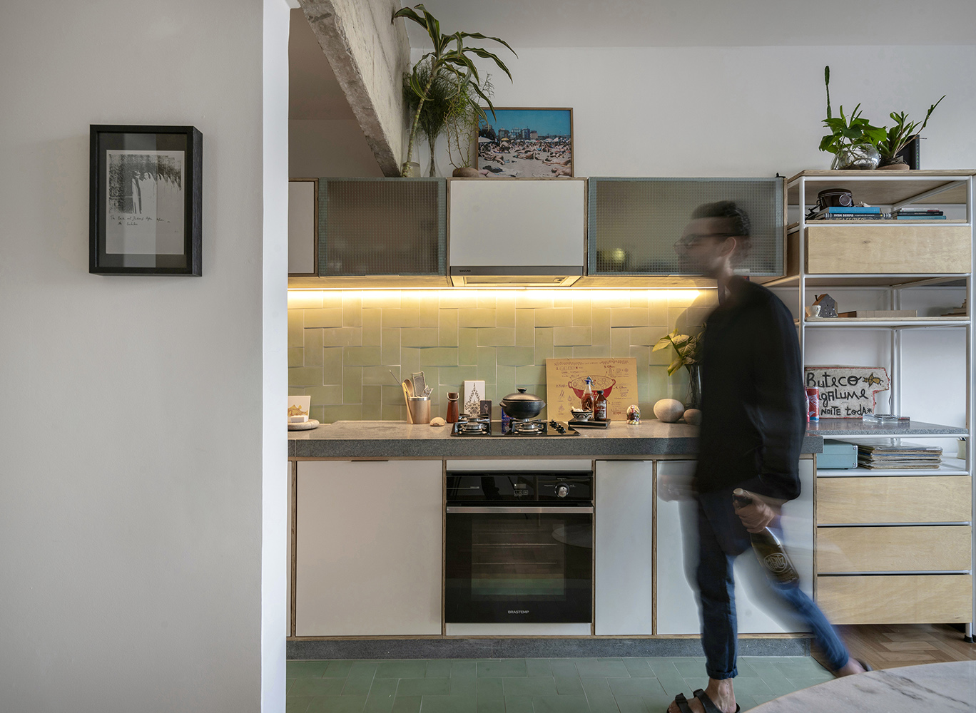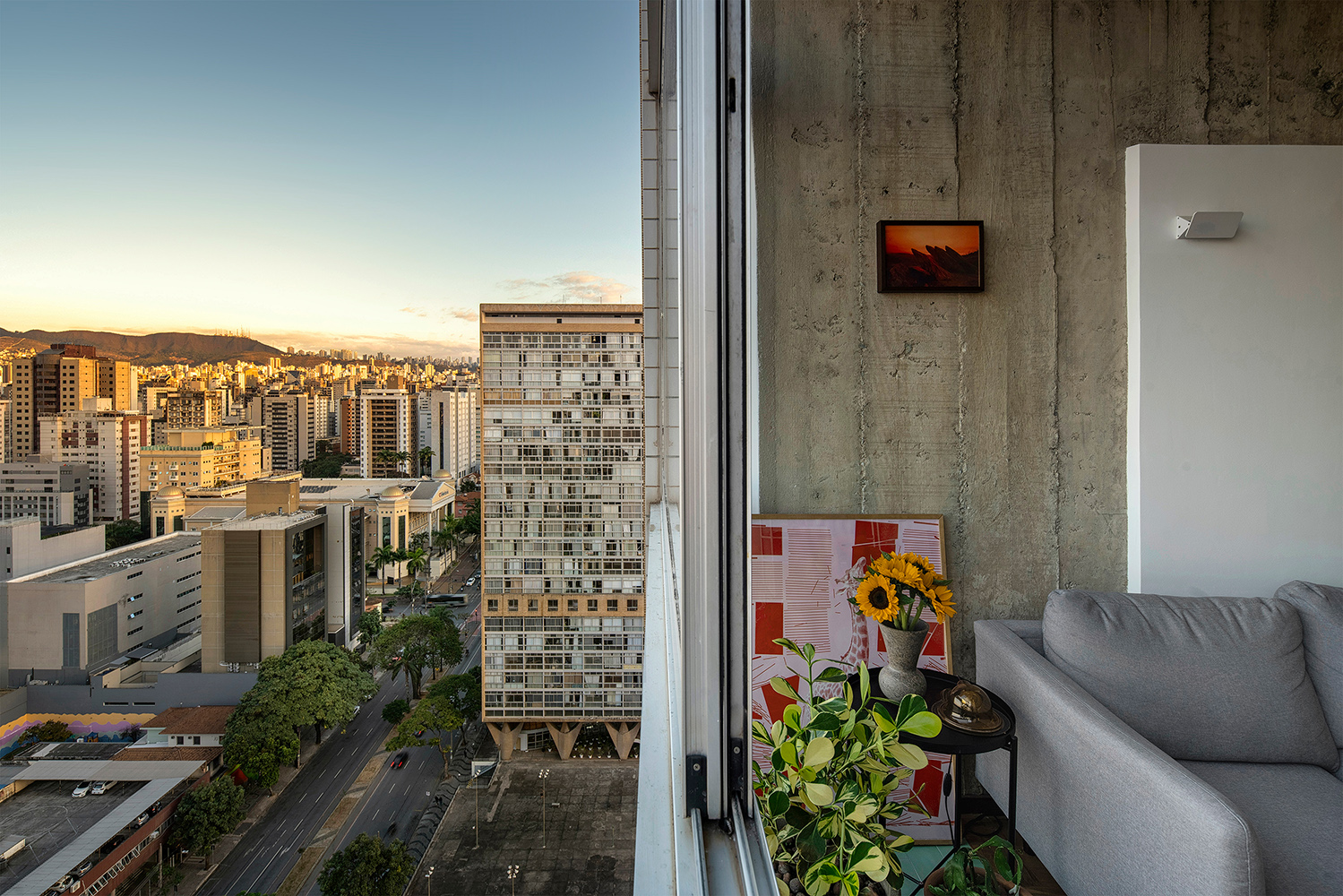 Entre as 13 diferentes tipologias dos apartamentos do JK, o projeto no qual trabalhamos consistiu na intervenção do semi-duplex do Bloco B, esta tipologia foi, primeiramente, desenvolvida por Niemeyer para o Hotel Quitandinha em Petrópolis e construída posteriormente na capital mineira.Explorada desde o século 19, a organização dos ambientes com plantas alternadas utilizando a técnica projetual do ‘planejamento em seção’ promove a redução de circulação coletivas, melhorias em termos de privacidade, controle térmico e ventilação cruzada.A renovação propõe uma valorização da fachada Leste do apartamento enquanto varanda/jardim ao passo que substitui um trecho do piso de tacos de madeira natural por ladrilhos hidráulicos para possibilitar um melhor cuidado e manejo das plantas. Por razões semelhantes relativas à umidade, propusemos a substituição do piso da cozinha.A intervenção foi disposta junto à prumada hidráulica e reforça a horizontalidade do espaço por meio do desenho de um móvel que ora faz as vias de estante, arquivo e escritório, ora armário, bancada molhada, forno, despensa e adega (com unidade em sua materialidade e proporções).Com intuito de integrar os cômodos existentes, propusemos fenestrar a parede divisória das escadas por meio de uma forma oval, com acabamento em aço patinável.