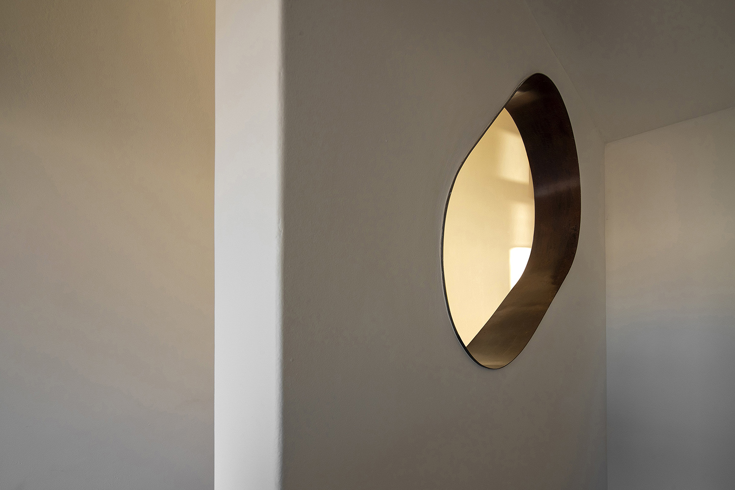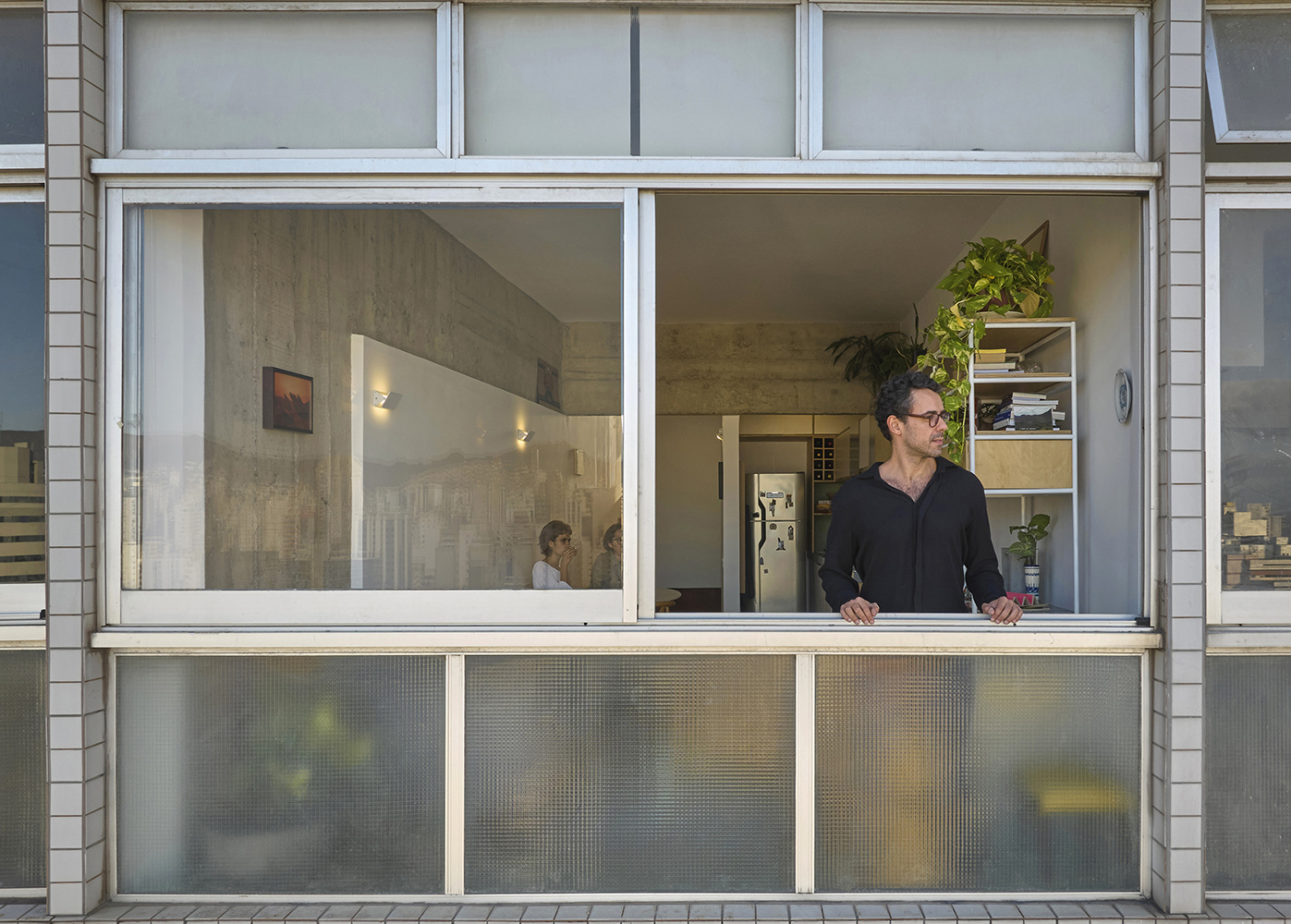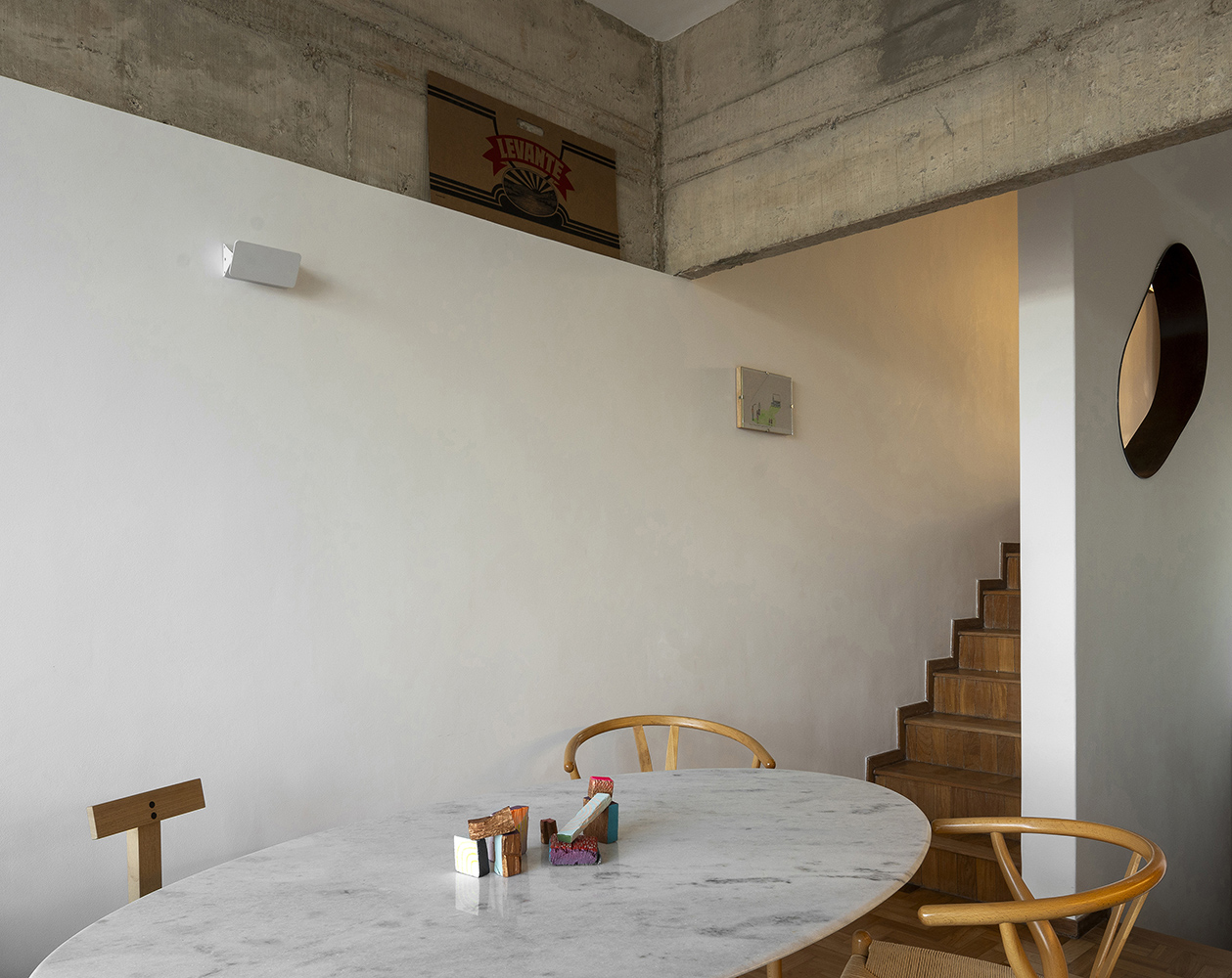Entre as 13 diferentes tipologias dos apartamentos do JK, o projeto no qual trabalhamos consistiu na intervenção do semi-duplex do Bloco B, esta tipologia foi, primeiramente, desenvolvida por Niemeyer para o Hotel Quitandinha em Petrópolis e construída posteriormente na capital mineira.Explorada desde o século 19, a organização dos ambientes com plantas alternadas utilizando a técnica projetual do ‘planejamento em seção’ promove a redução de circulação coletivas, melhorias em termos de privacidade, controle térmico e ventilação cruzada.A renovação propõe uma valorização da fachada Leste do apartamento enquanto varanda/jardim ao passo que substitui um trecho do piso de tacos de madeira natural por ladrilhos hidráulicos para possibilitar um melhor cuidado e manejo das plantas. Por razões semelhantes relativas à umidade, propusemos a substituição do piso da cozinha.A intervenção foi disposta junto à prumada hidráulica e reforça a horizontalidade do espaço por meio do desenho de um móvel que ora faz as vias de estante, arquivo e escritório, ora armário, bancada molhada, forno, despensa e adega (com unidade em sua materialidade e proporções).Com intuito de integrar os cômodos existentes, propusemos fenestrar a parede divisória das escadas por meio de uma forma oval, com acabamento em aço patinável.