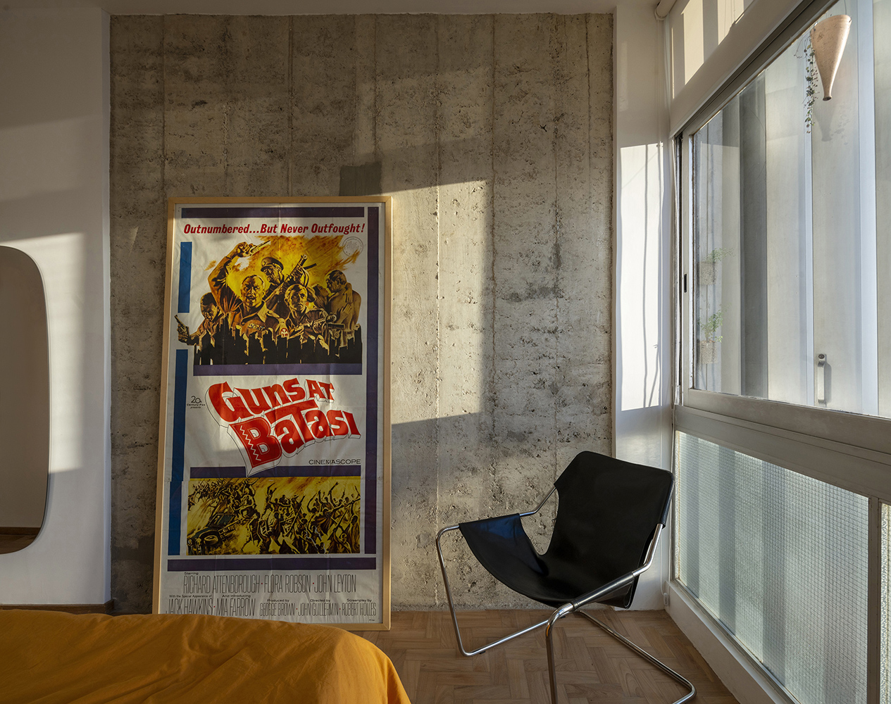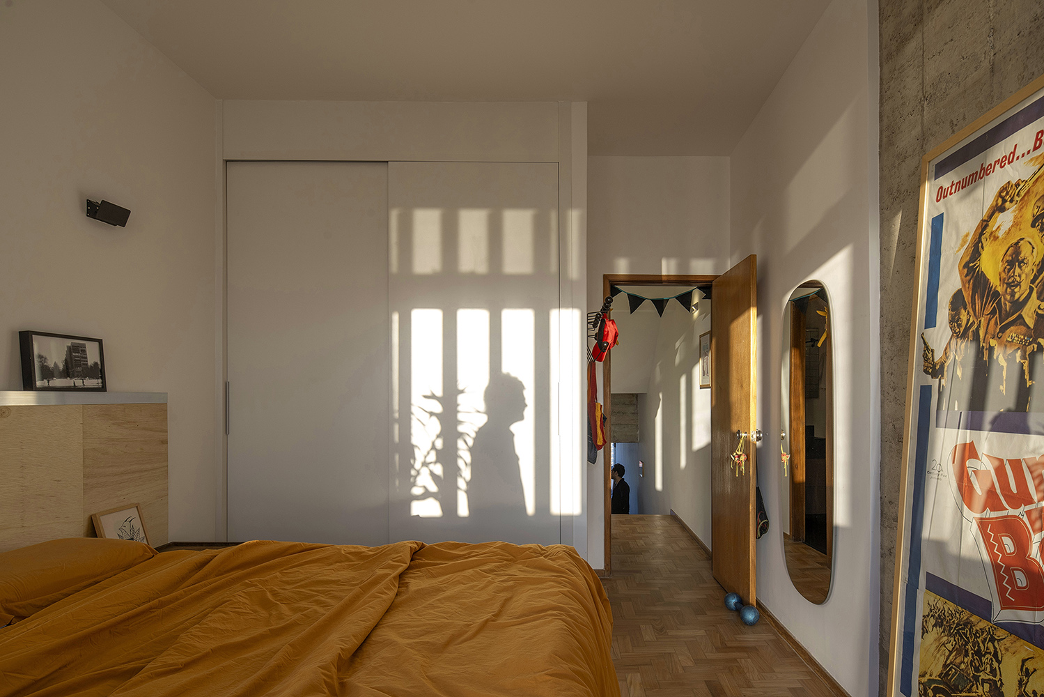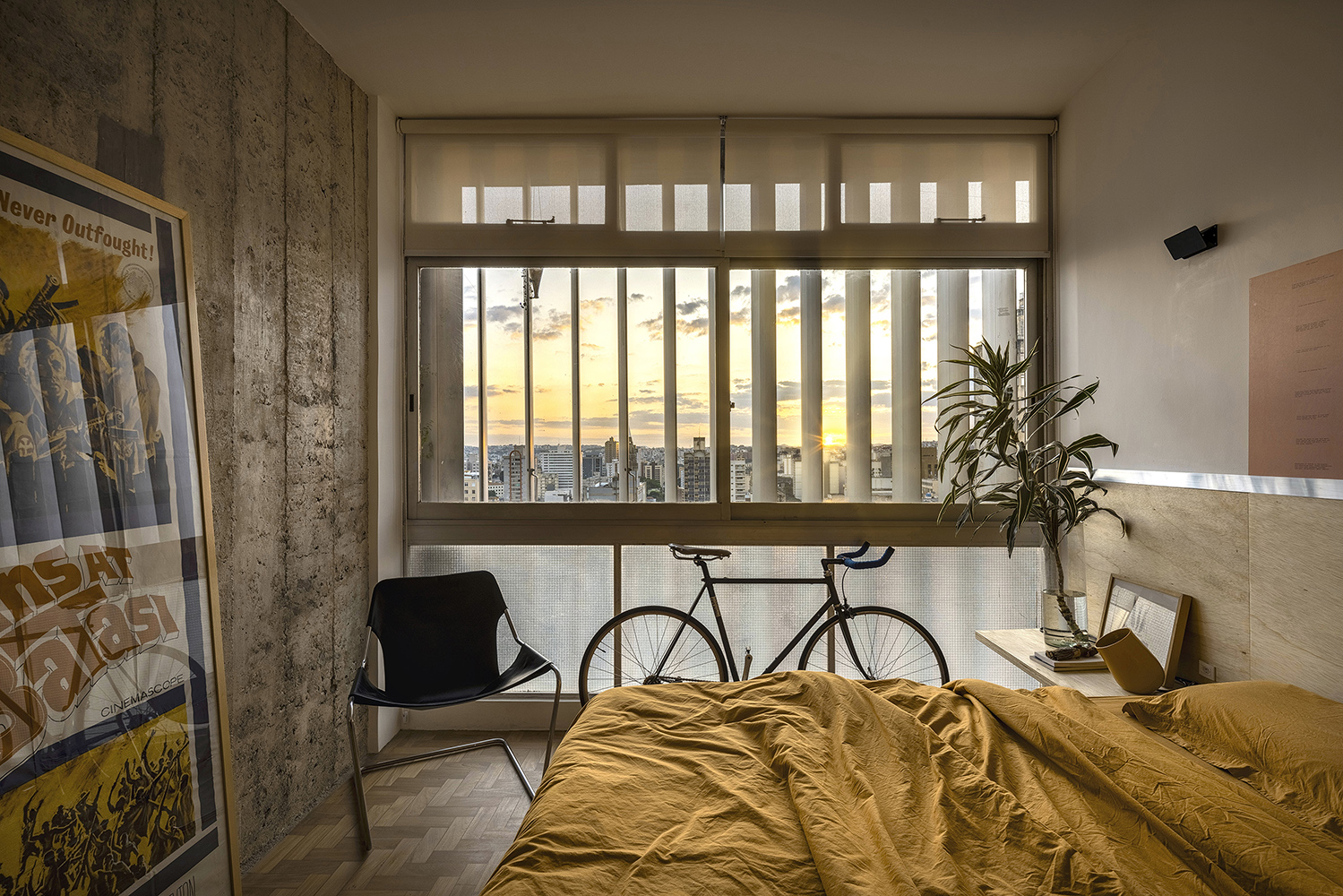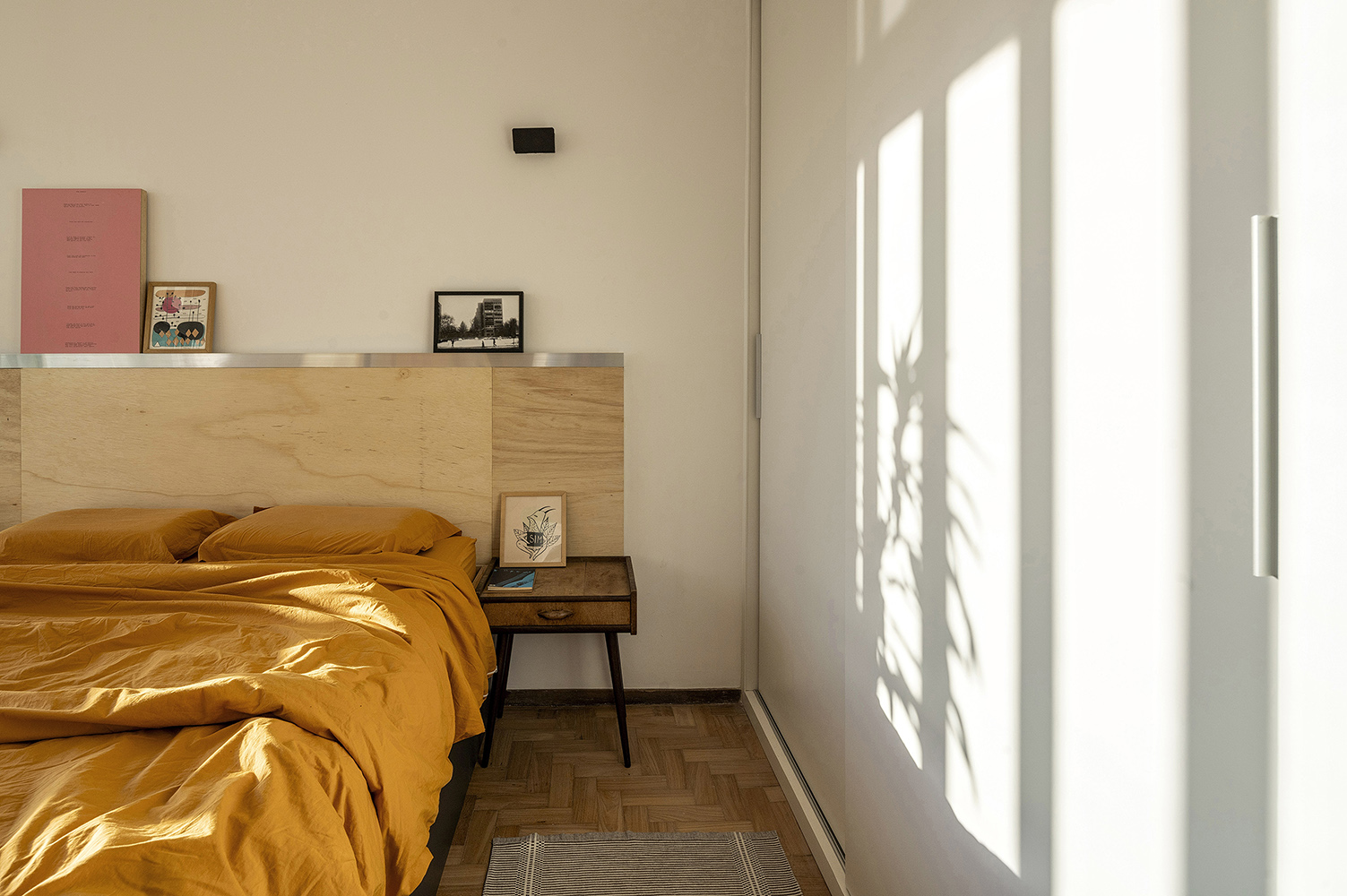 No meio-nível superior, foi proposta uma cabeceira/galeria em compensado naval e reforma da marcenaria existente assim como o ato de expor a estrutura em concreto armado existente em contraste com a espessura e tons das alvenarias. Esta decisão foi tomada também em outros momentos do apartamento, de forma a evidenciar a prospecção da infraestrutura de suporte que julgamos, por bem, deixá-las à mostra.