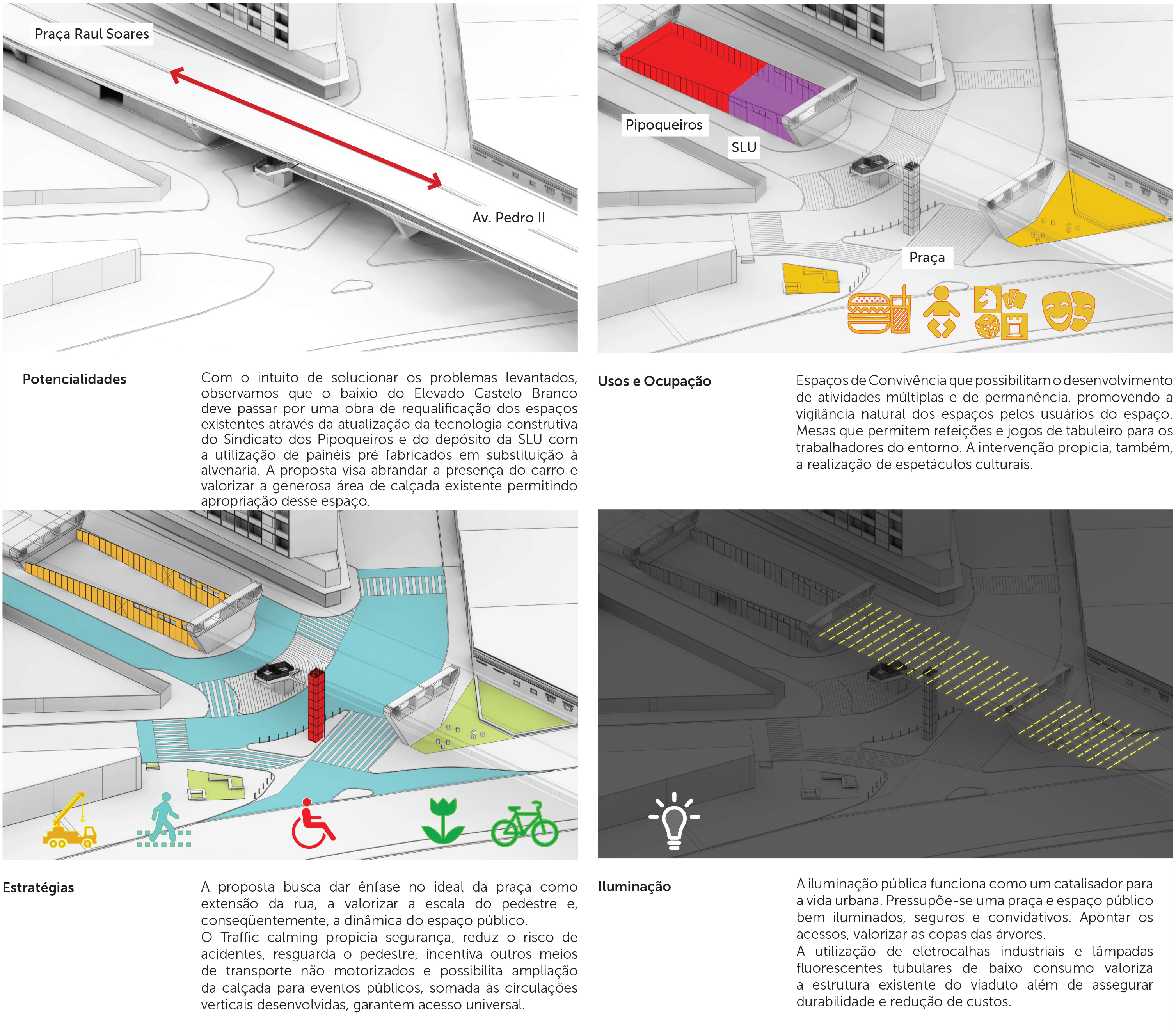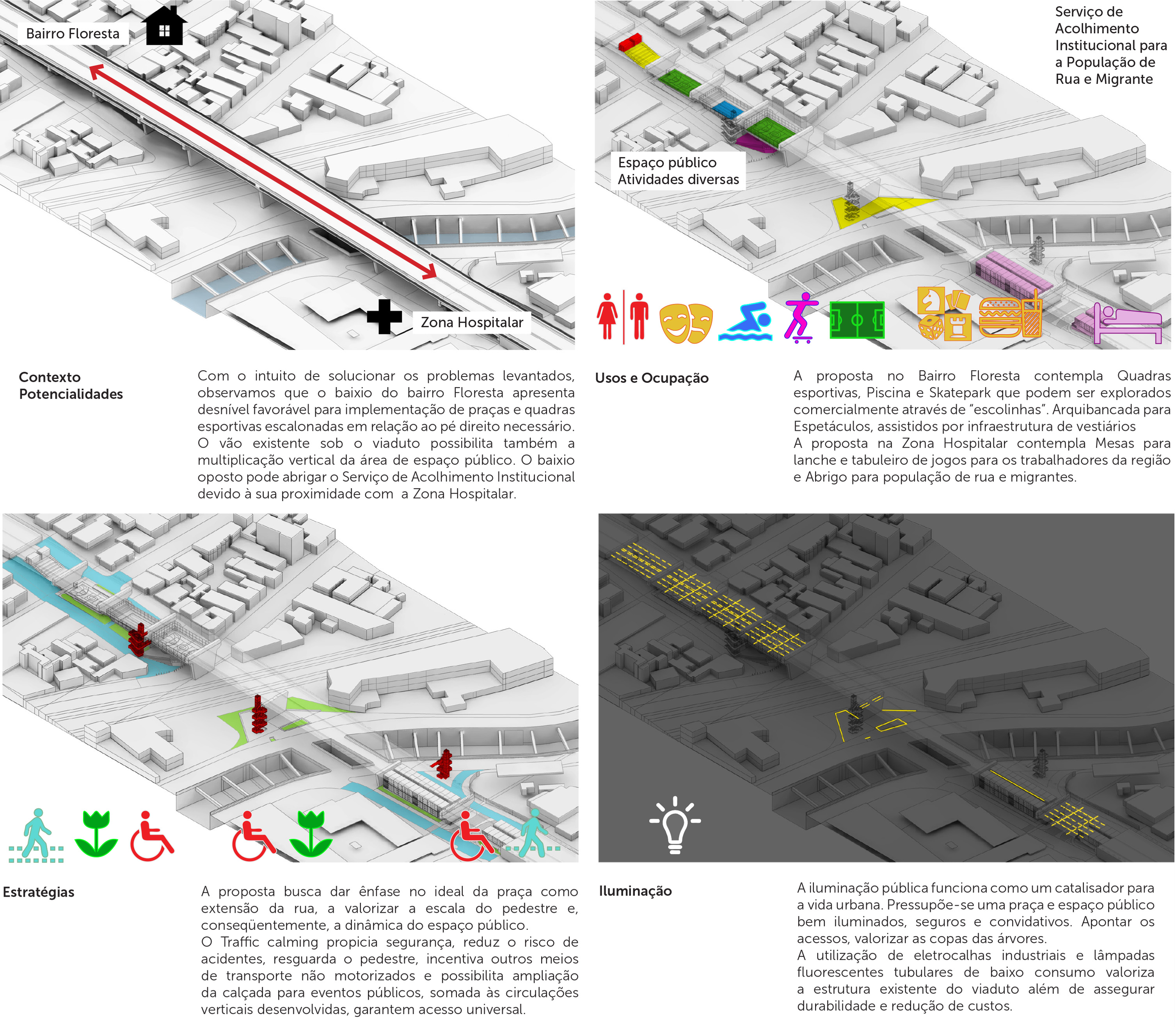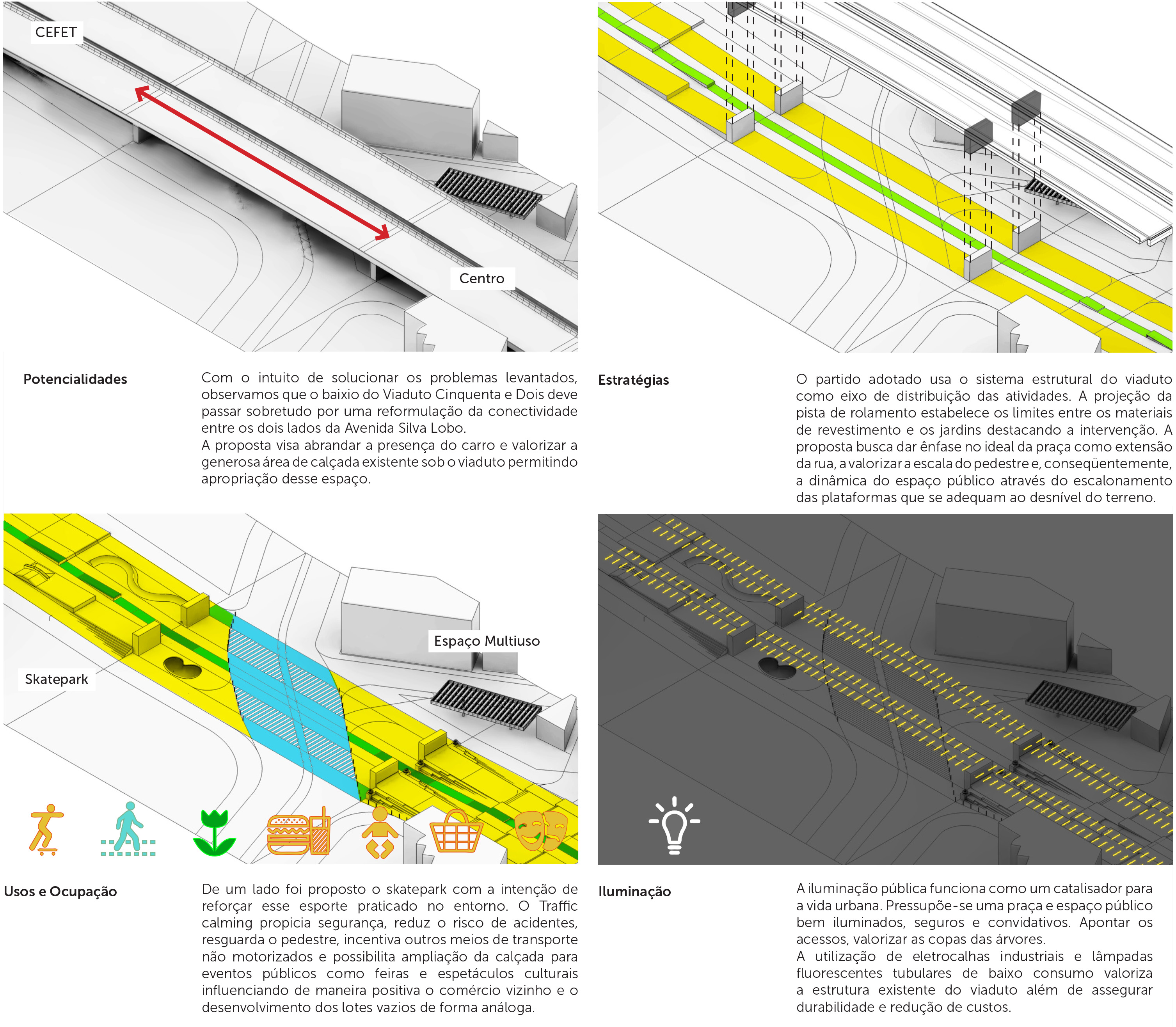 Os baixios de viadutos são espaços culturalmente tidos como residuais, mas que conservam em si, devido à sua estratégica inserção urbana e à sua ampla superfície para aproveitamento, um grande potencial para se tornarem áreas qualificadas para encontros e para a realização de atividades ao ar livre, desde que objetos de requalificação urbanística. Tais ações reverteriam o estigma do abandono que ronda essas áreas, ampliando sua vitalidade, segurança e bem-estar social.