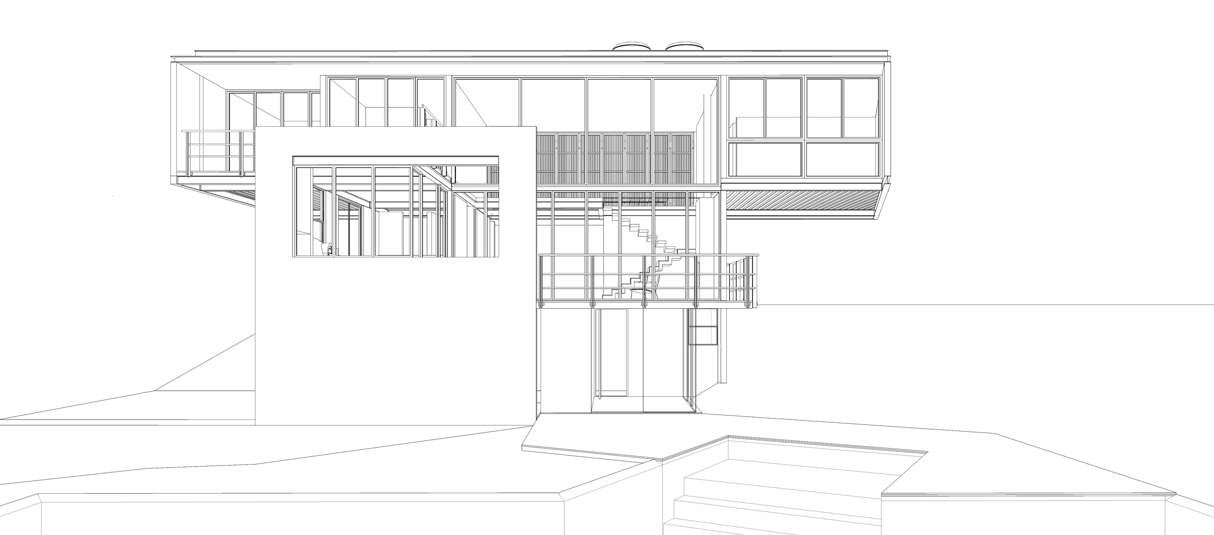 A organização é de forma escalonada, minimizando os cortes no terreno, separando claramente áreas de lazer e convivência da parte íntima da casa.