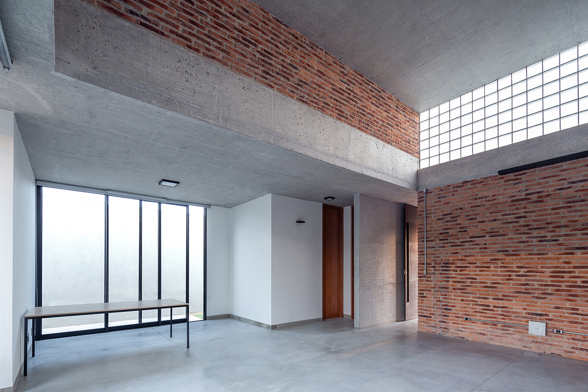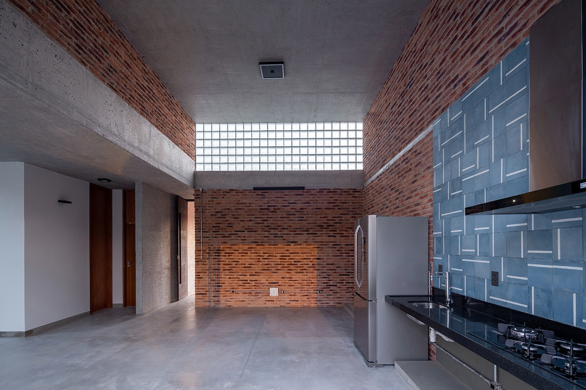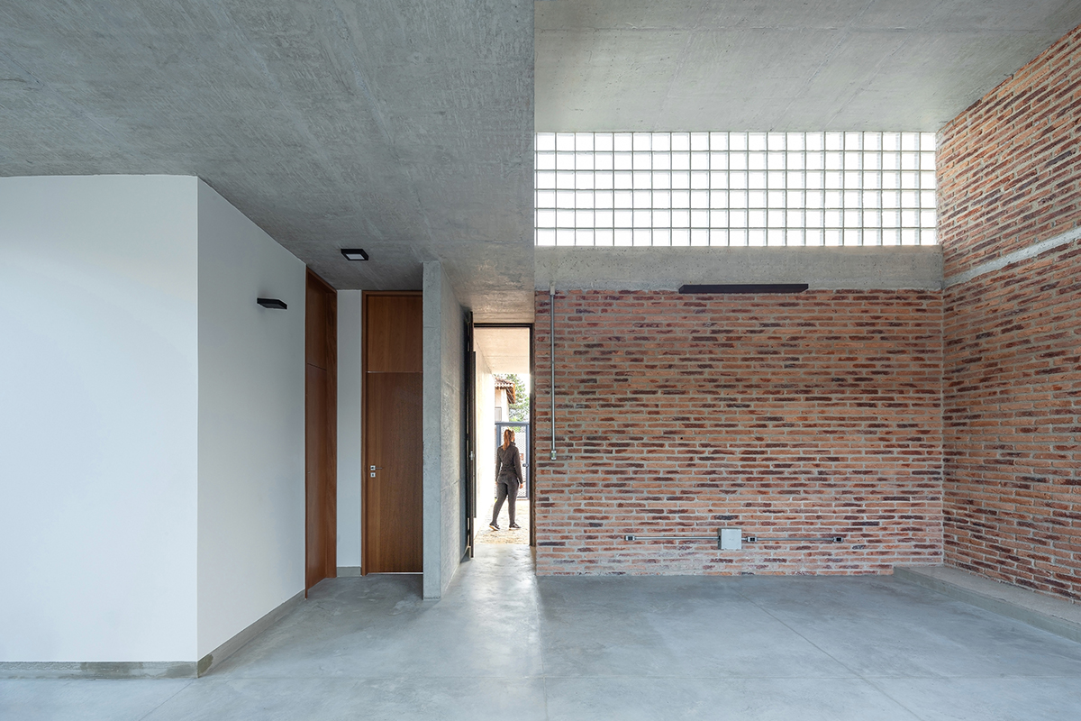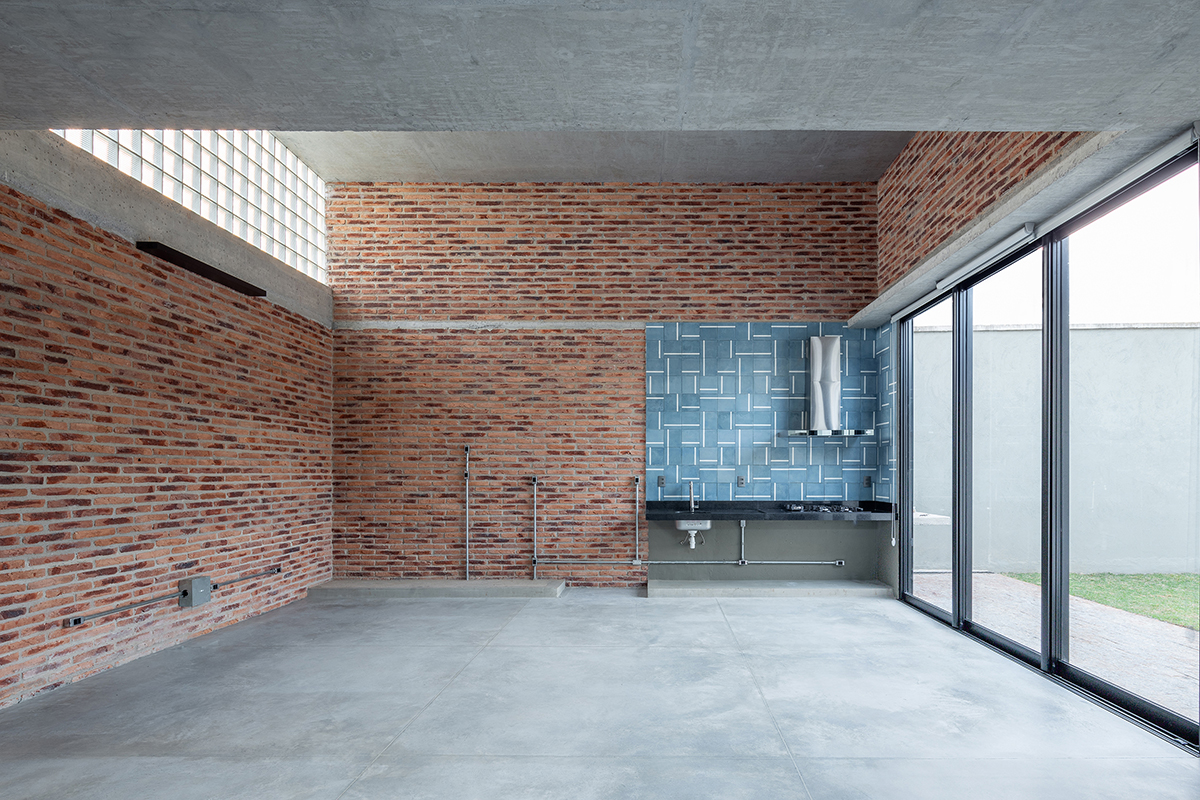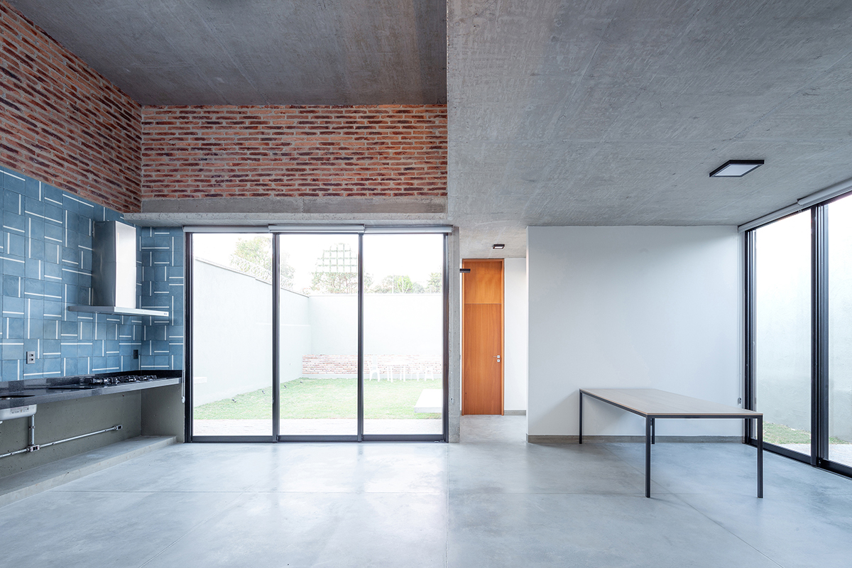 As noções de pátio e varanda norteiam a concepção do projeto, de maneira que todos os cômodos são integrados e têm acesso à área externa. A sala de estar integrada à cozinha configura o espaço central da casa, com pé direito maior, fechado para a fachada da rua e aberto para o pátio principal, de forma que a casa é ampliada em dias de eventos familiares ou refeições ao ar livre.
