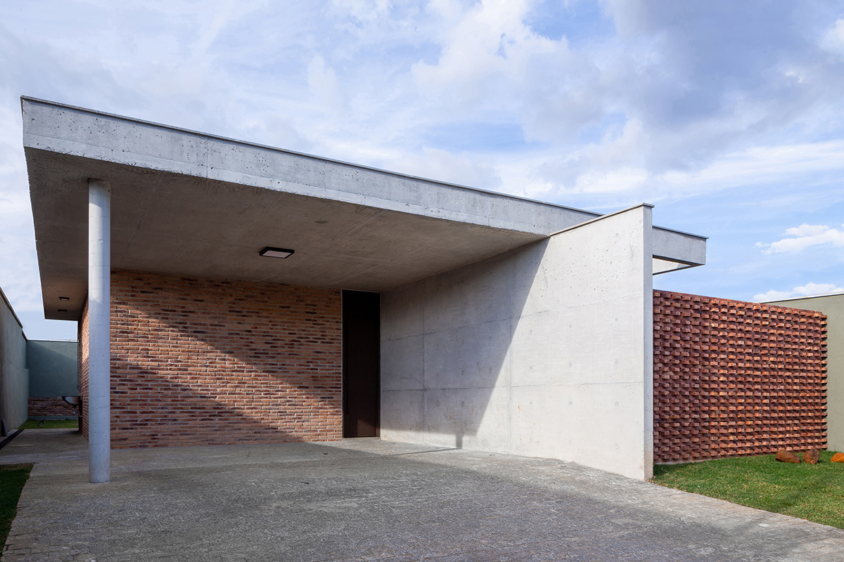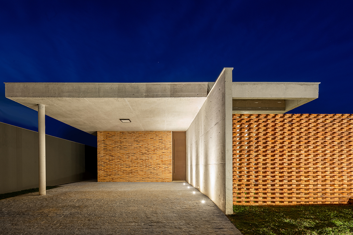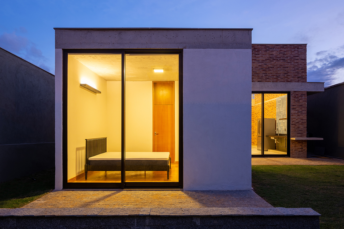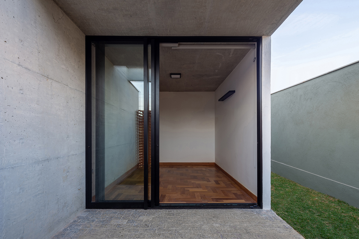 Os quartos também são integrados à área externa, em pátios menores, através do uso de portas de correr ao invés de janelas. Para resguardar a varanda do quarto voltado para a rua, foi criada uma parede vazada com uma paginação de tijolos maciços intercalados.