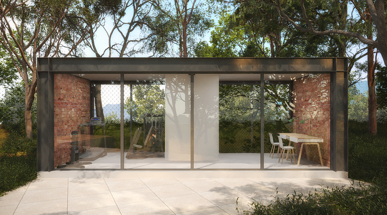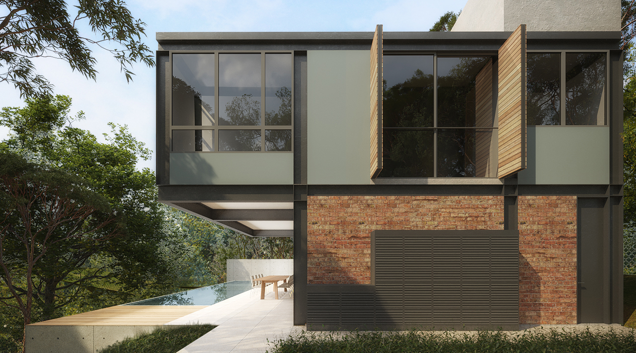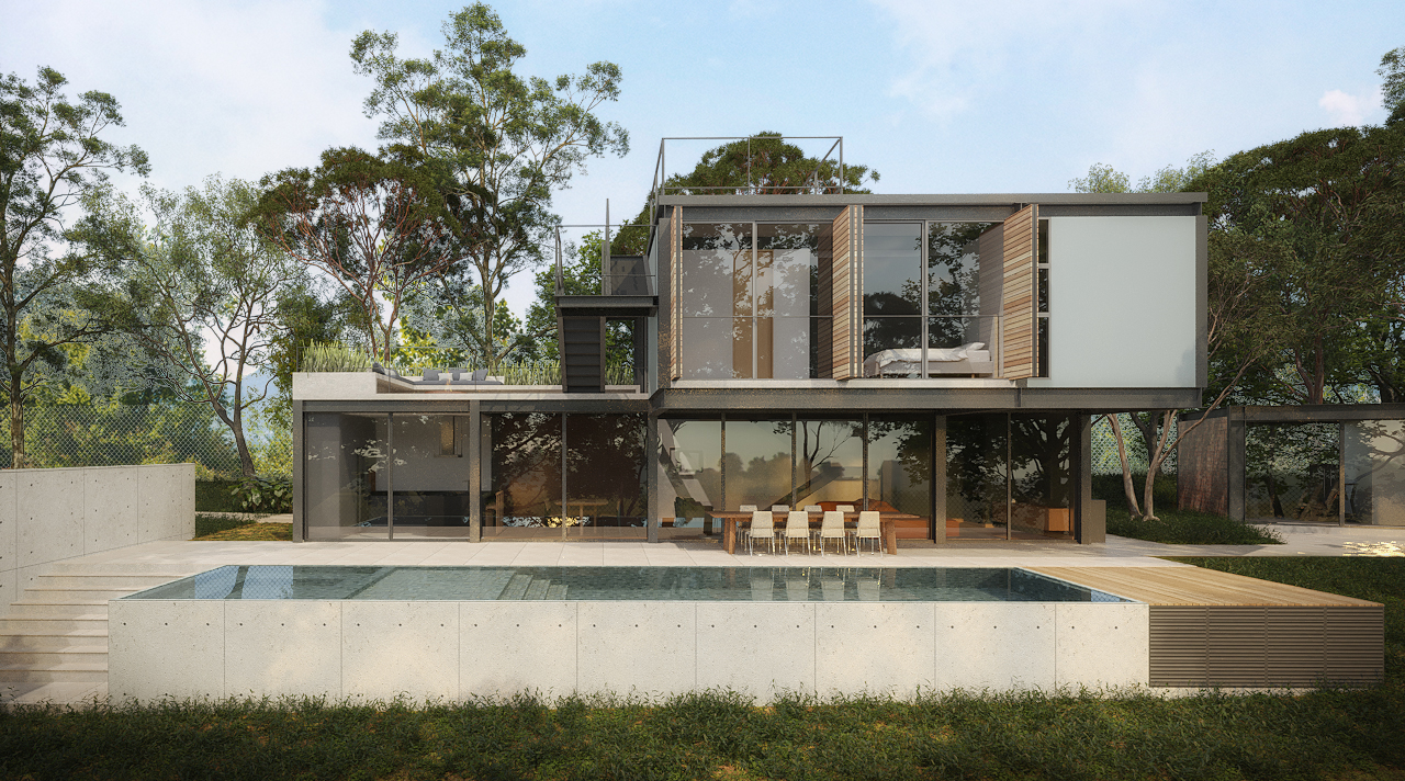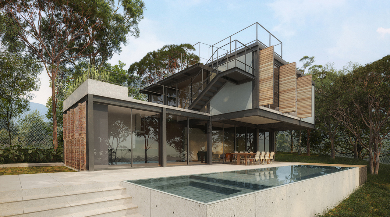 A residência se organiza a partir da implantação da piscina com maior insolação possível e de pontos fundamentais da construção metálica como: Leveza, Precisão, Estética Própria, Fabricação, Montagem e Transportabilidade.