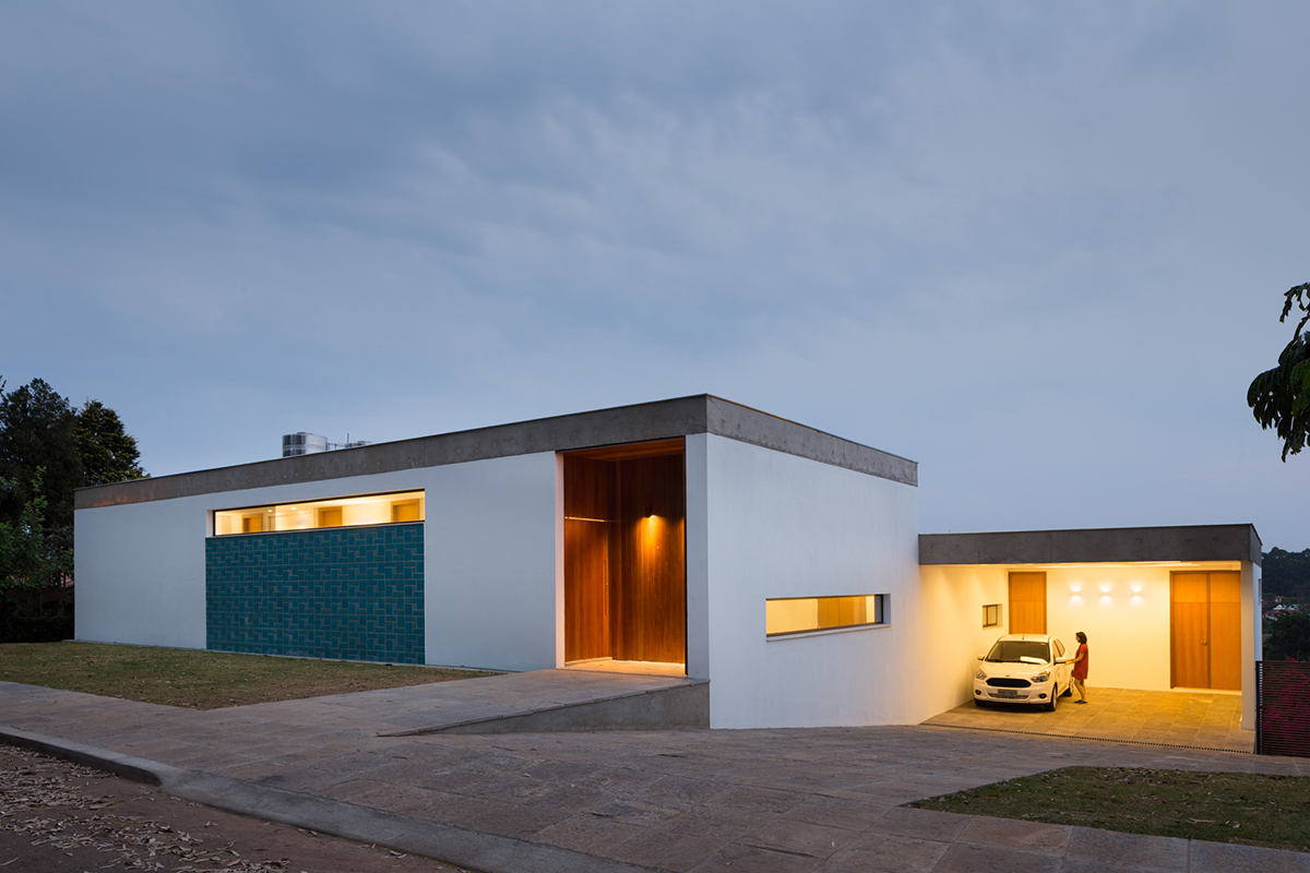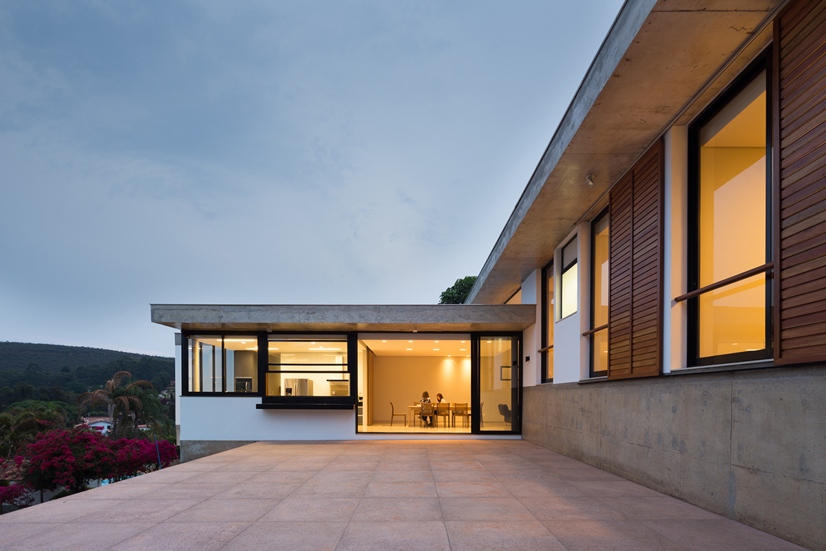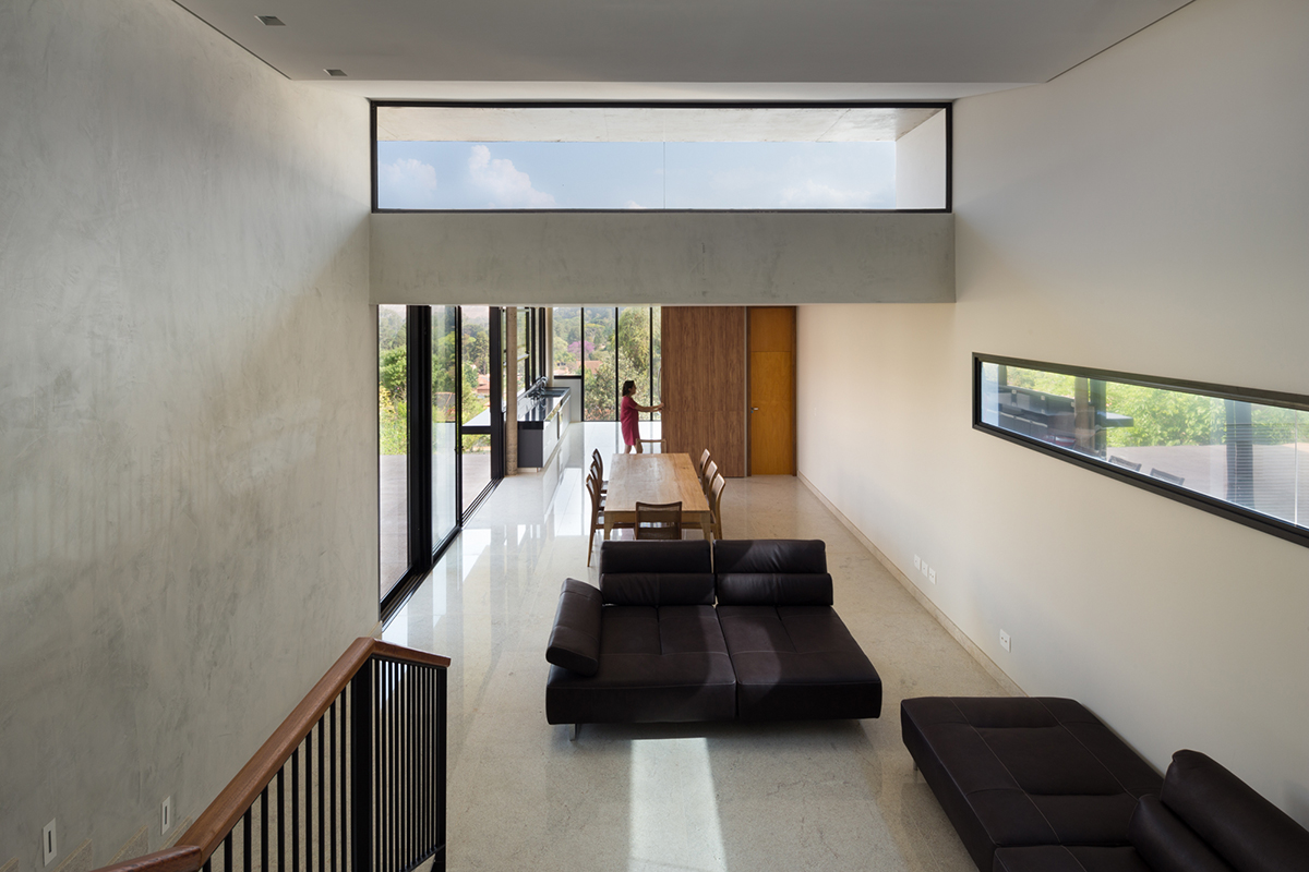 A sala e cozinha são integradas com um pátio externo que exerce ponto de convergência e encontro da casa.
