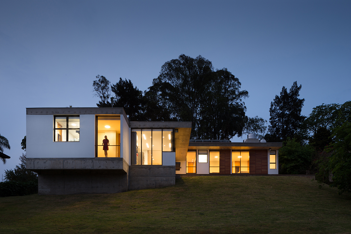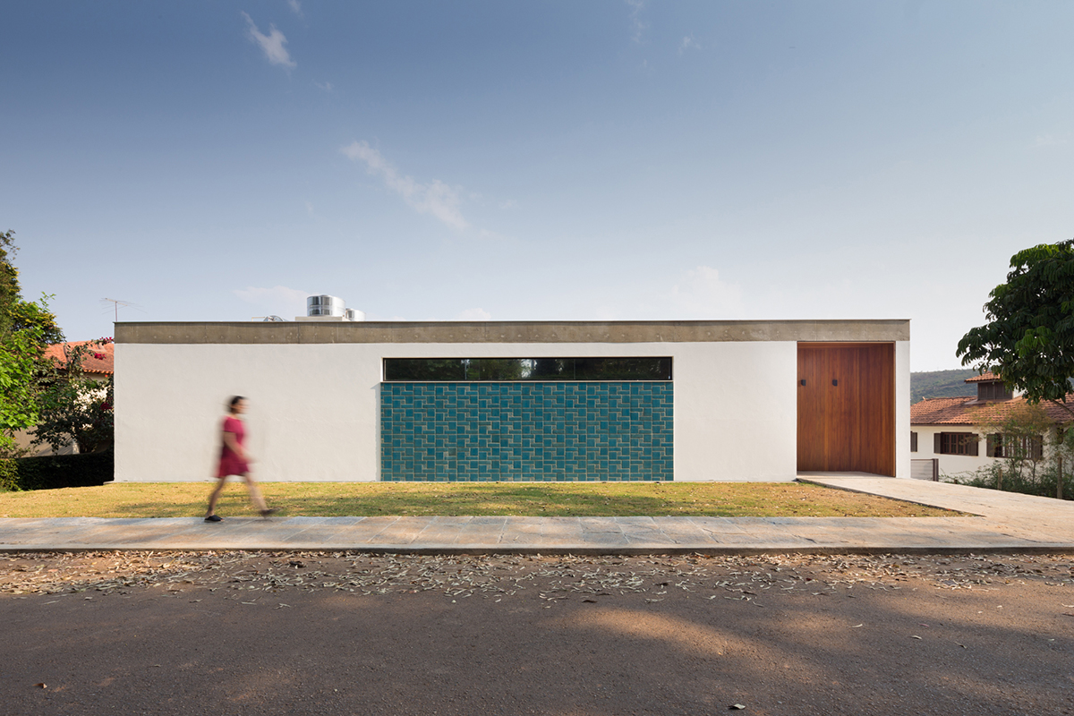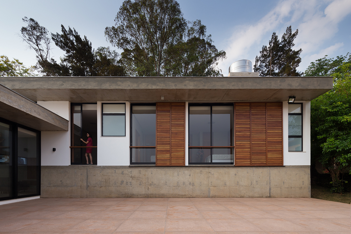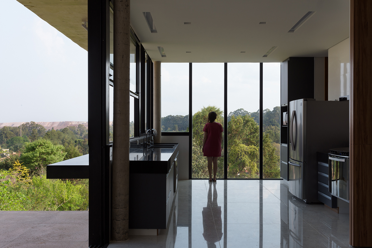 A sala e cozinha são integradas com um pátio externo que exerce ponto de convergência e encontro da casa.