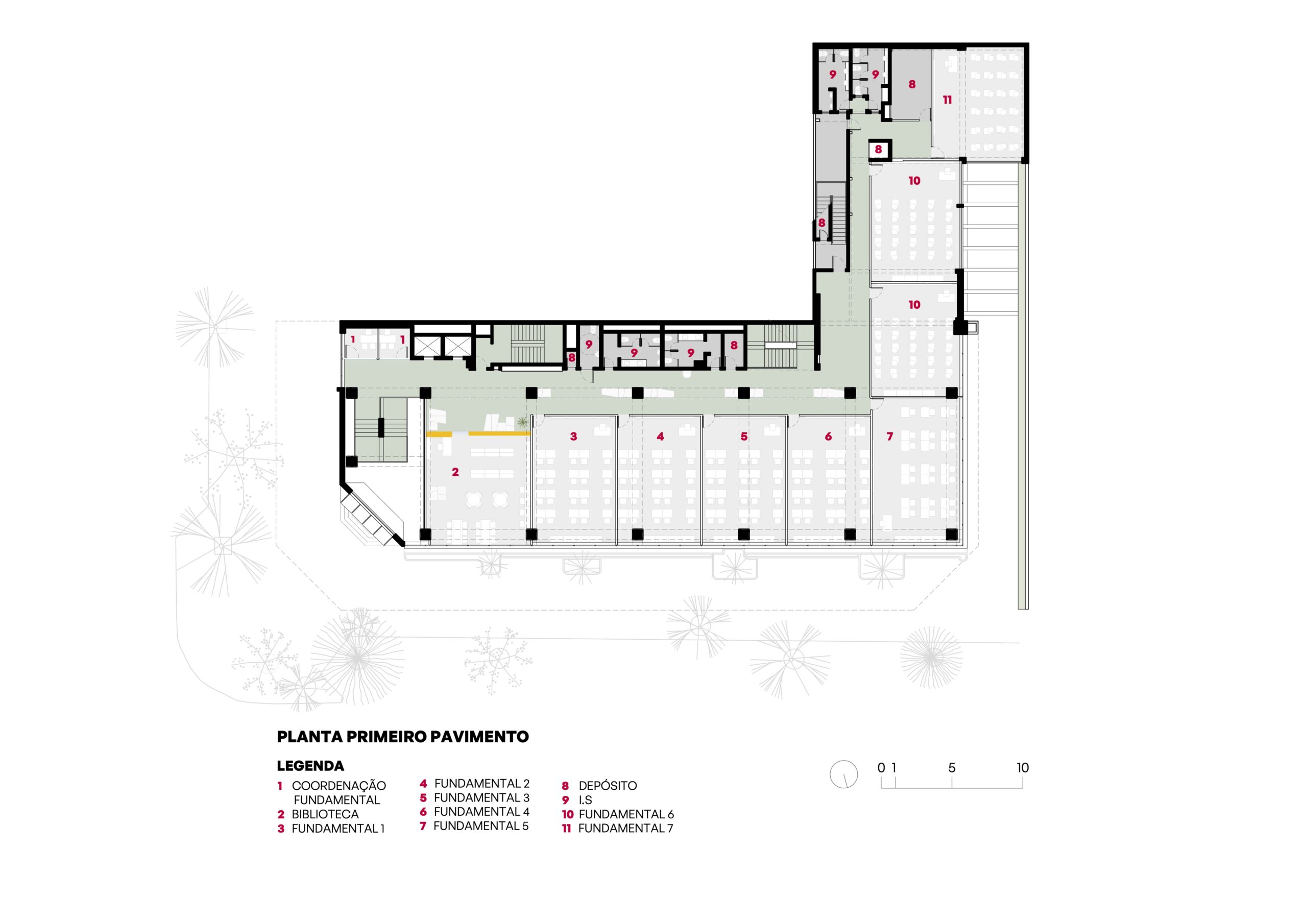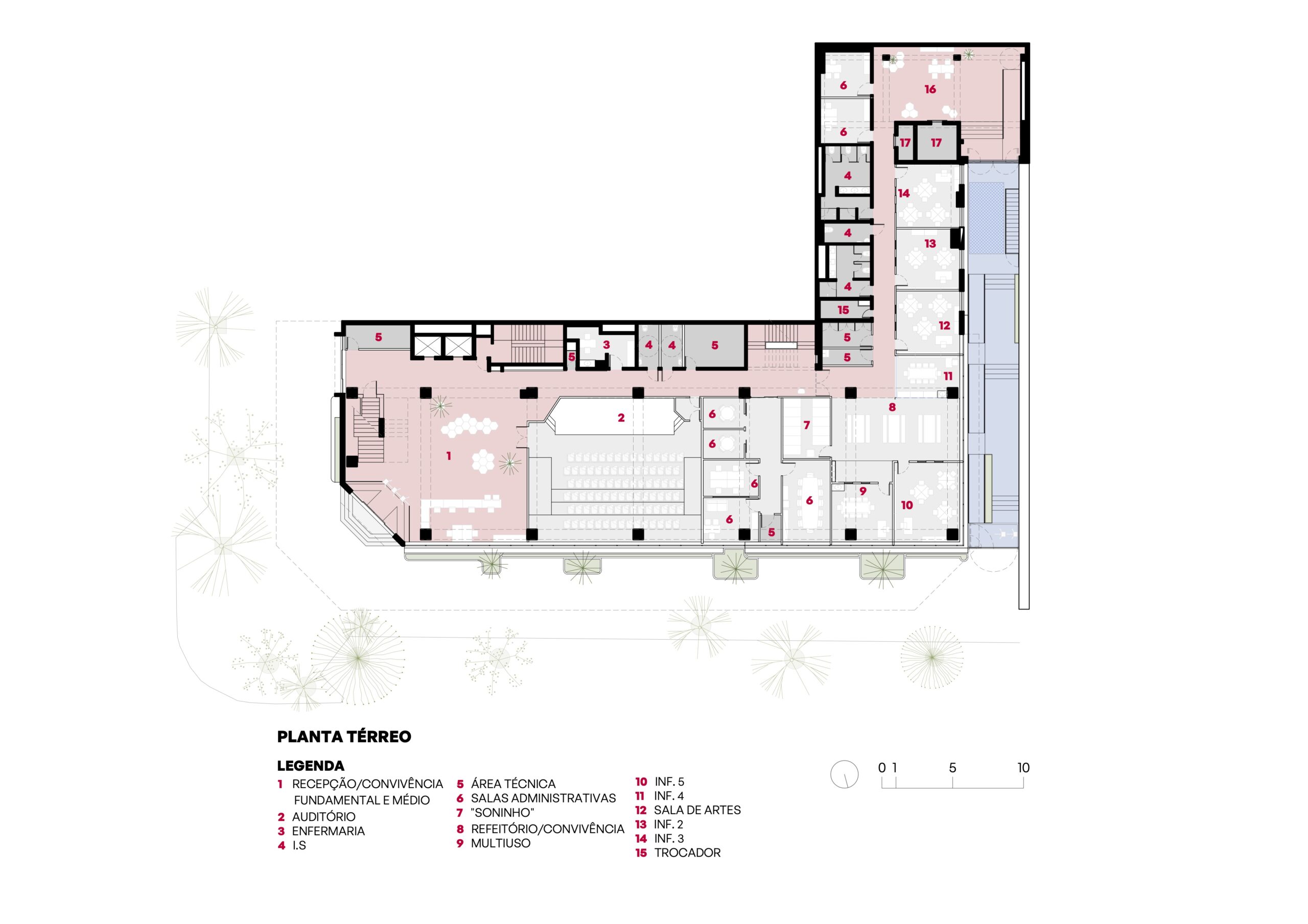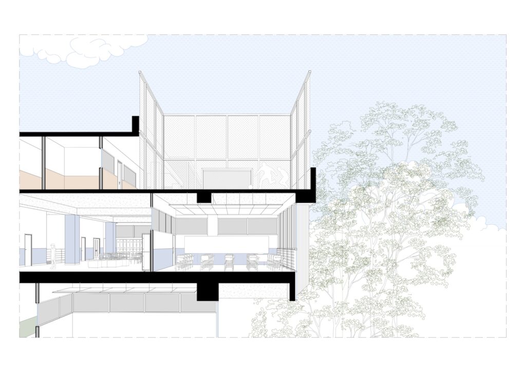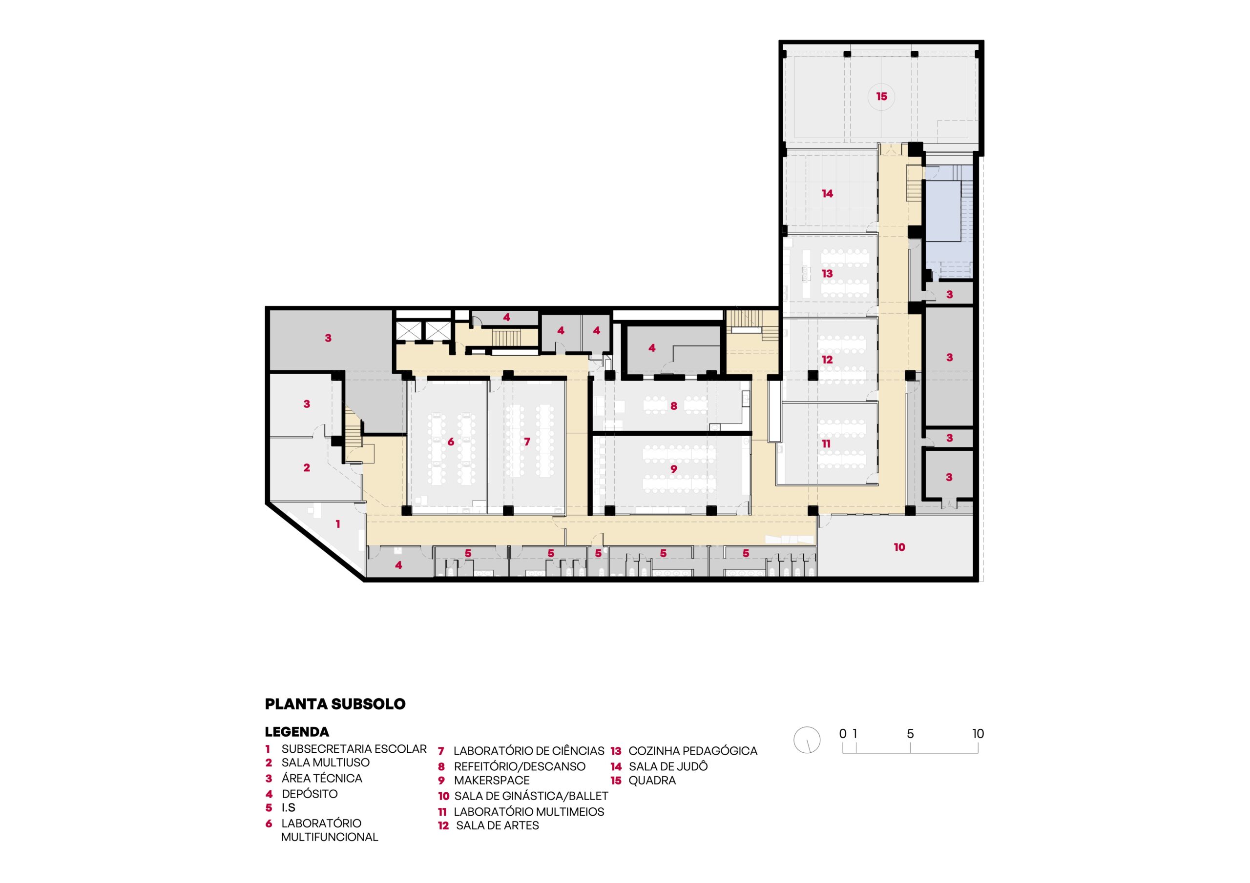 Nos laboratórios localizados no subsolo e nas salas do ensino infantil, foram projetadas aberturas de diferentes dimensões, promovendo integração visual e funcional entre ambientes, sem comprometer a fluidez dos espaços. Ainda no subsolo, foi criada uma quadra coberta voltada para o ensino infantil, estrategicamente posicionada próxima às salas de aula para facilitar o acesso dos pequenos.