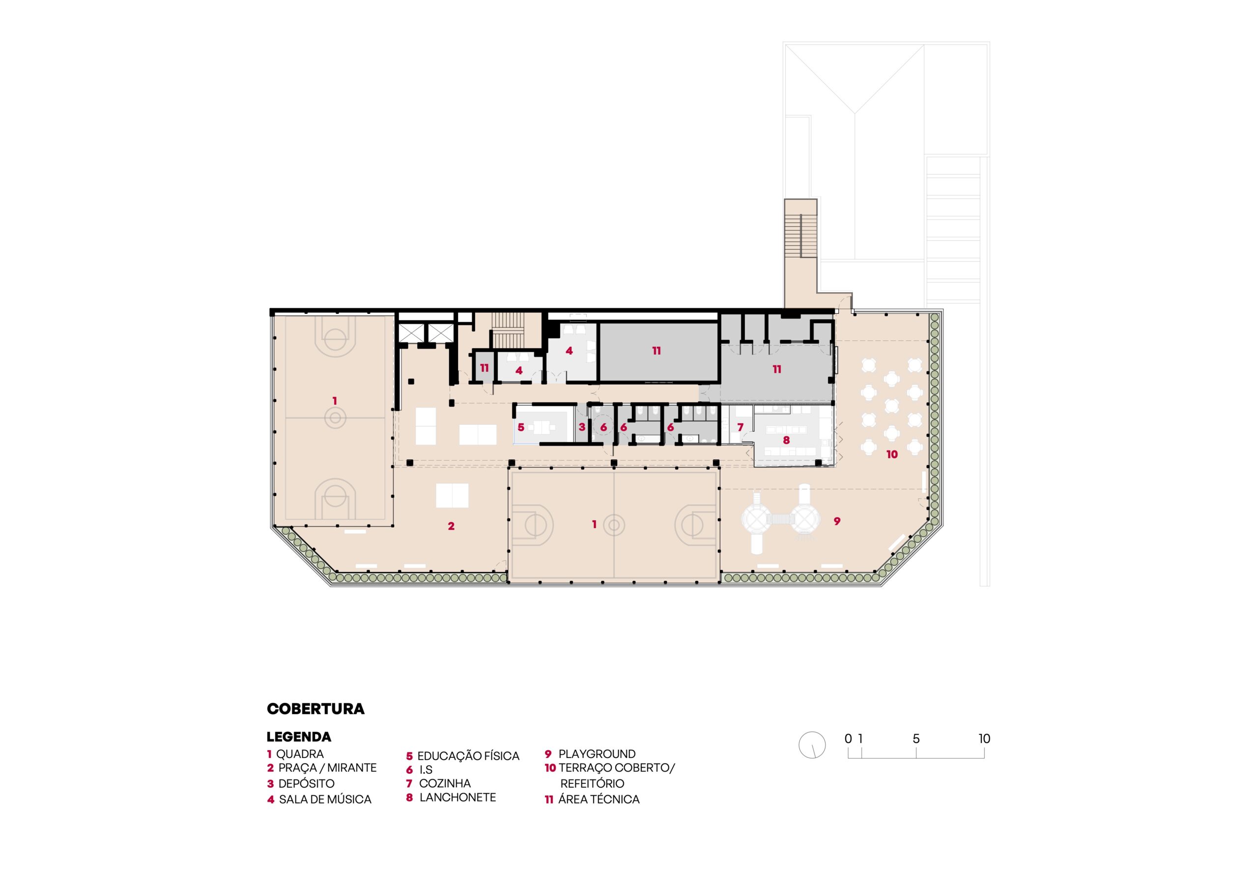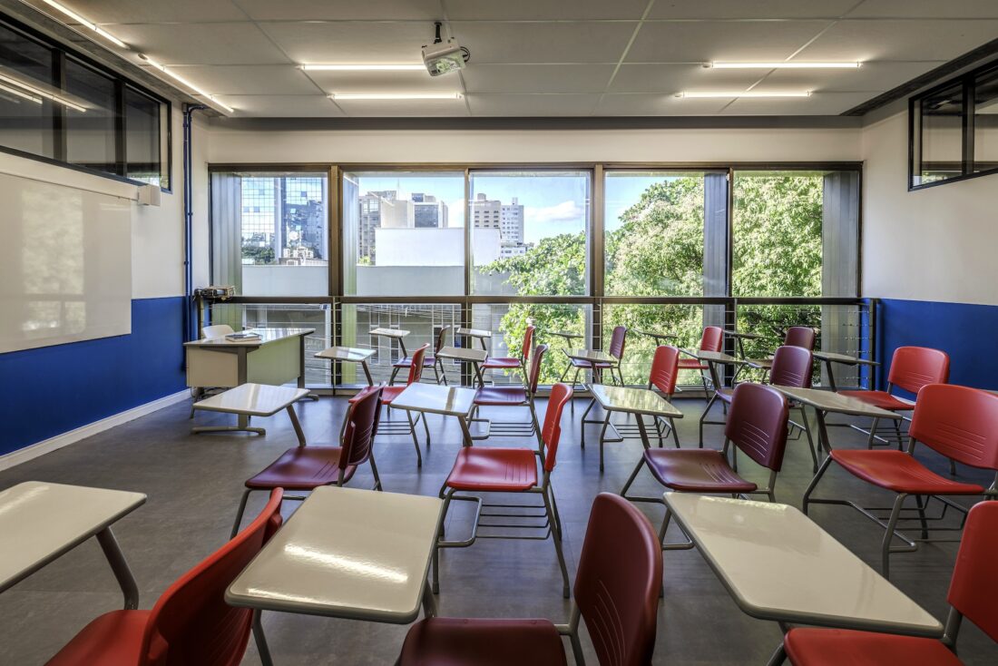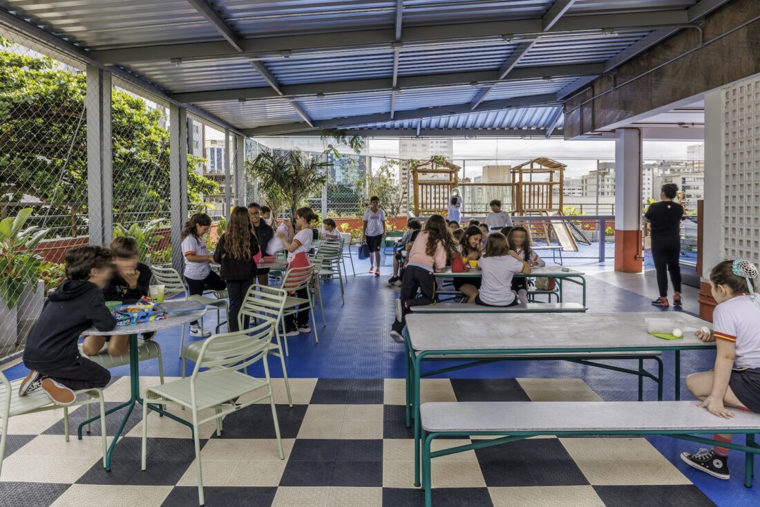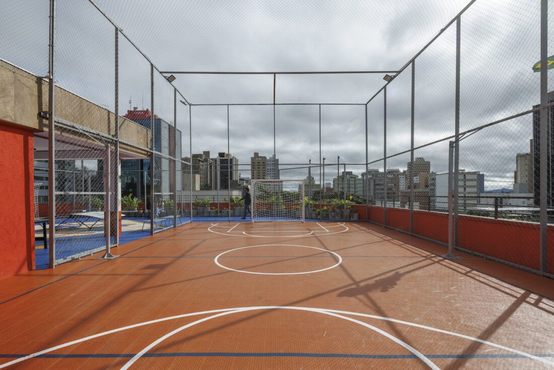 Por fim, o terraço foi transformado em uma praça esportiva e de convivência, com vista para a cidade e ampla incidência de luz natural — um verdadeiro espaço de respiro e integração. O projeto não apenas respeitou e valorizou a história do edifício, como também trouxe inovação, funcionalidade e um novo olhar sobre o papel da arquitetura no ambiente escolar. O resultado é uma escola dinâmica, inspiradora e profundamente conectada com a cidade e com quem a habita.