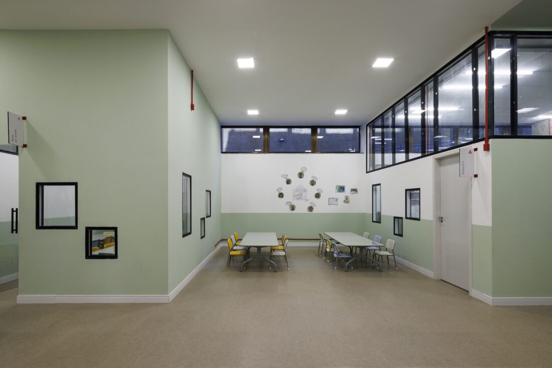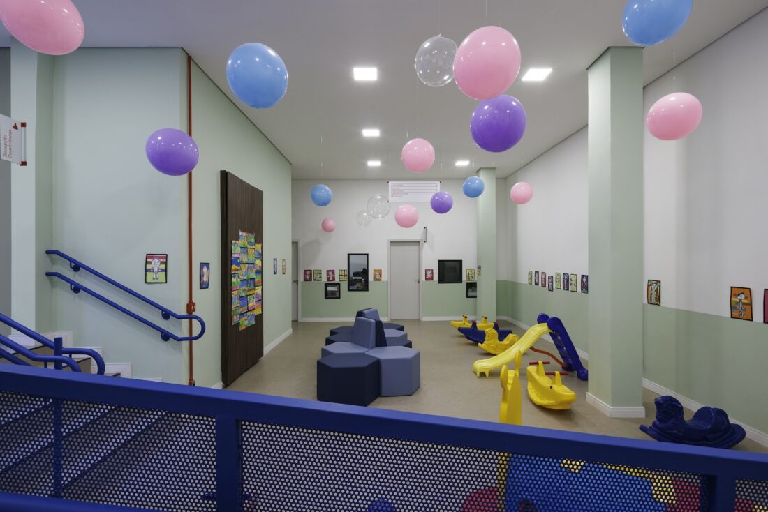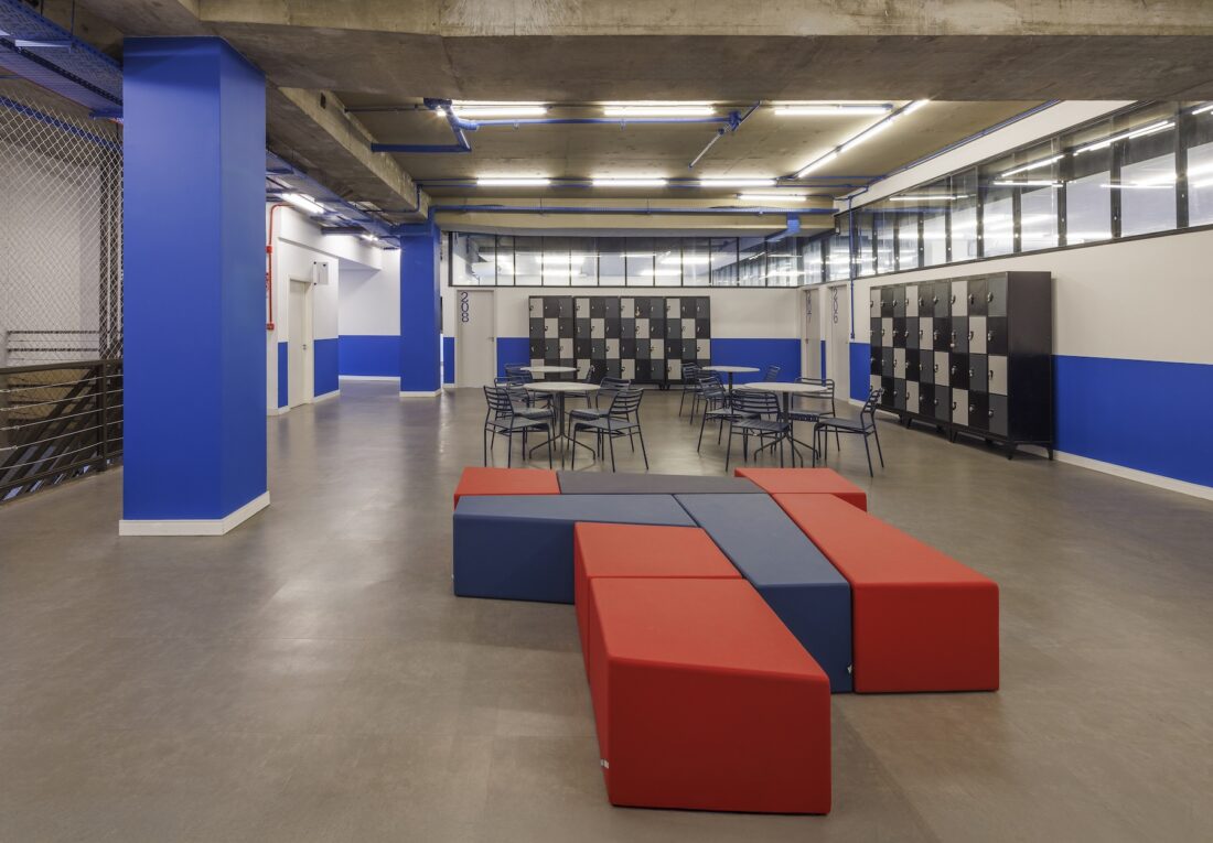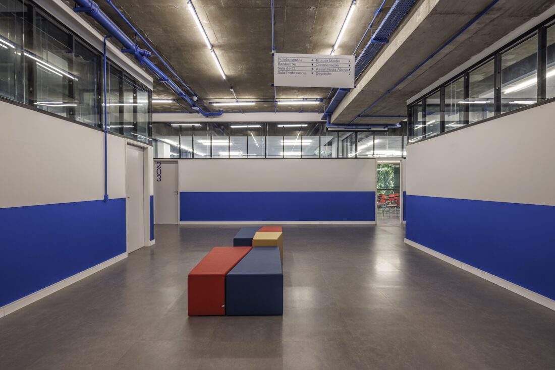 As estruturas originais do edifício foram mantidas expostas, transformando o próprio prédio em um “terceiro professor” — conceito que reconhece o ambiente como um agente ativo na experiência educativa, estimulando a curiosidade e o aprendizado através da arquitetura.