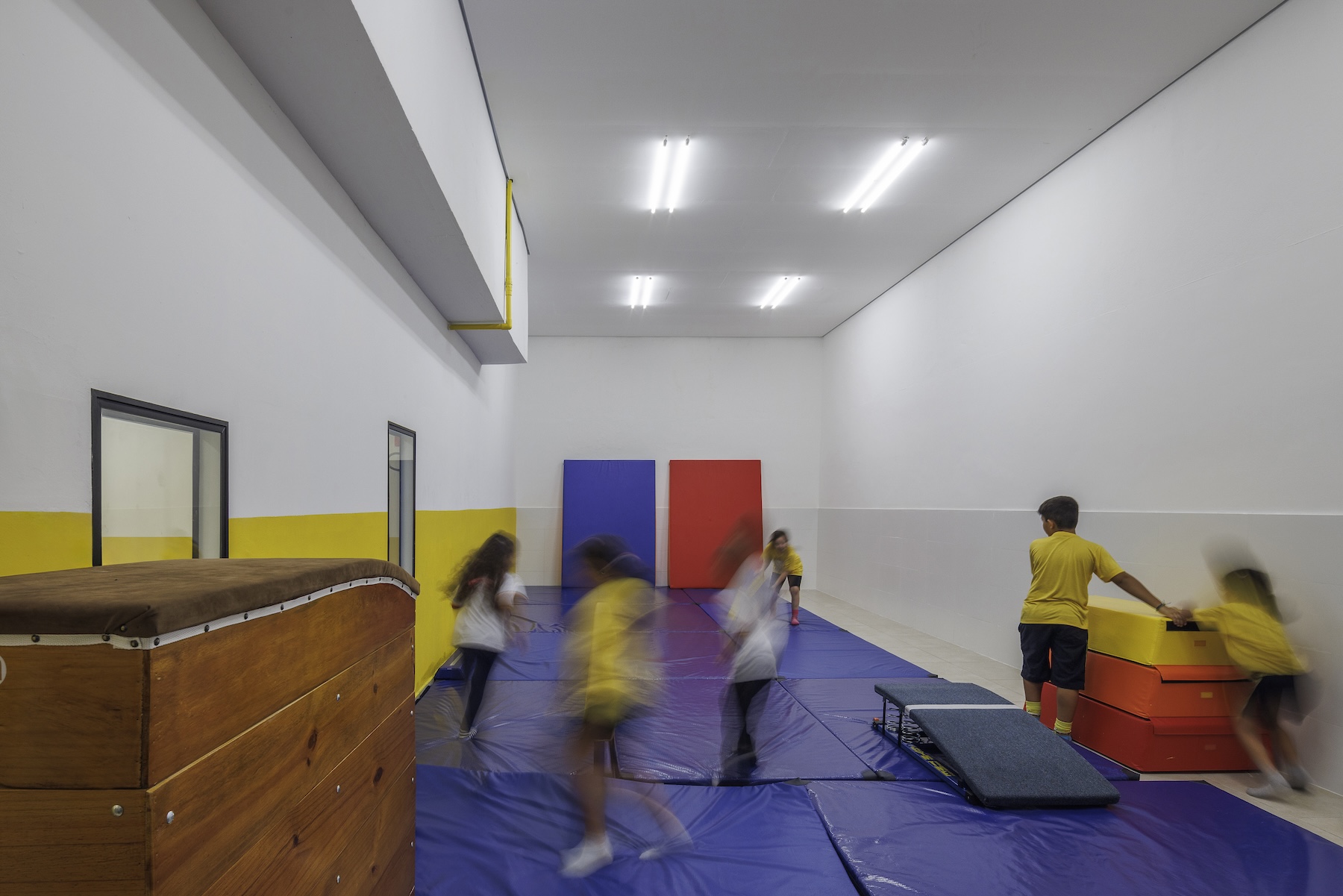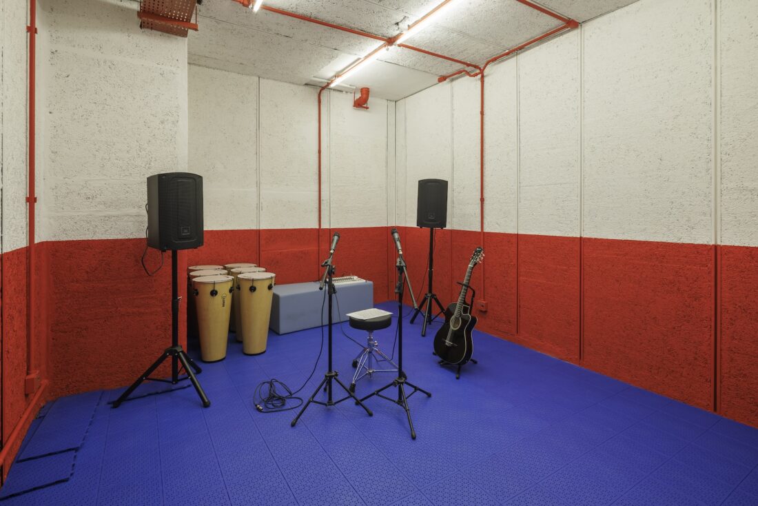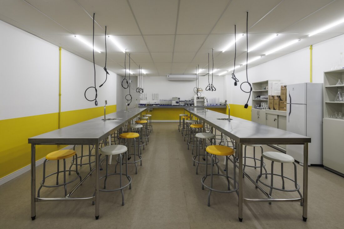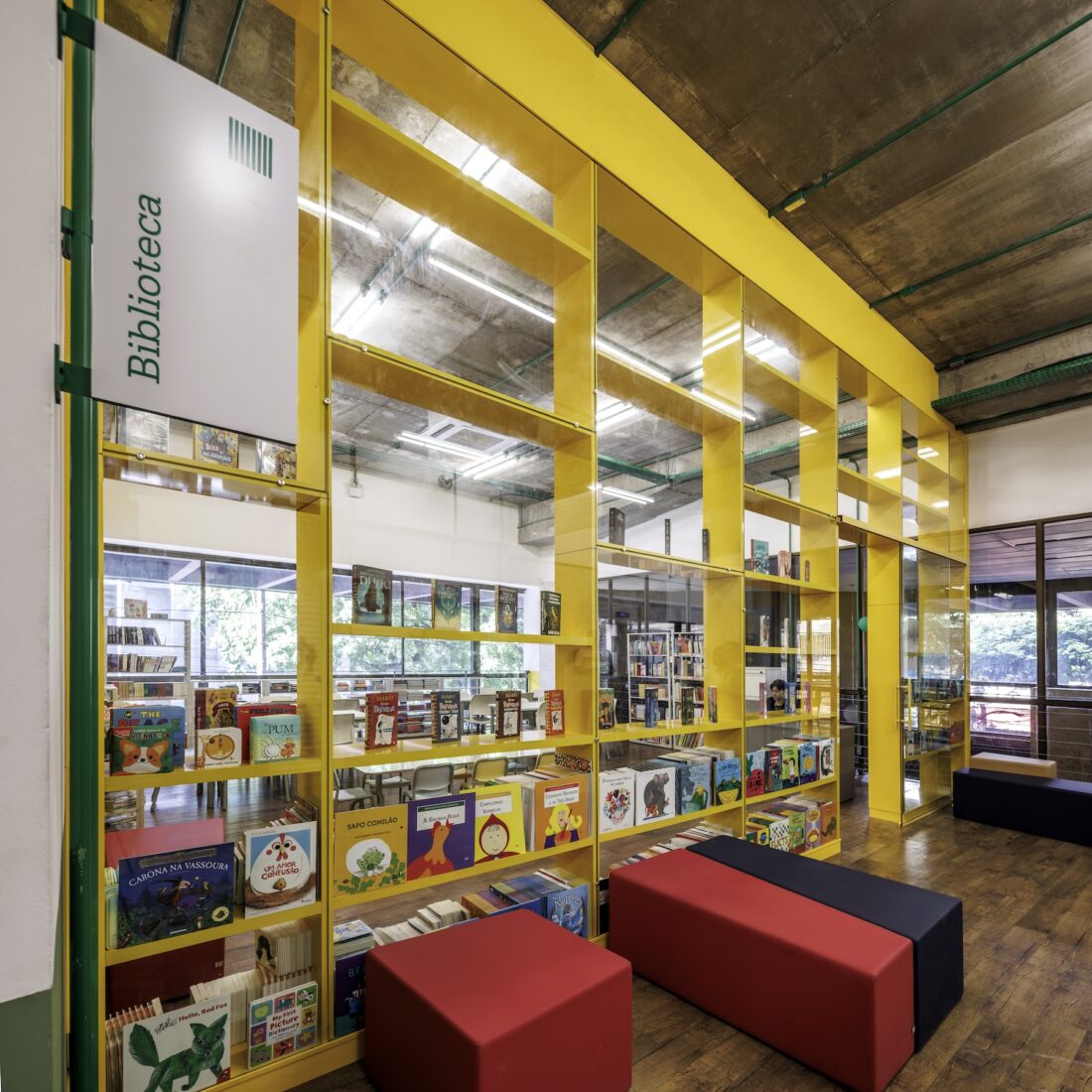 As estruturas originais do edifício foram mantidas expostas, transformando o próprio prédio em um “terceiro professor” — conceito que reconhece o ambiente como um agente ativo na experiência educativa, estimulando a curiosidade e o aprendizado através da arquitetura.