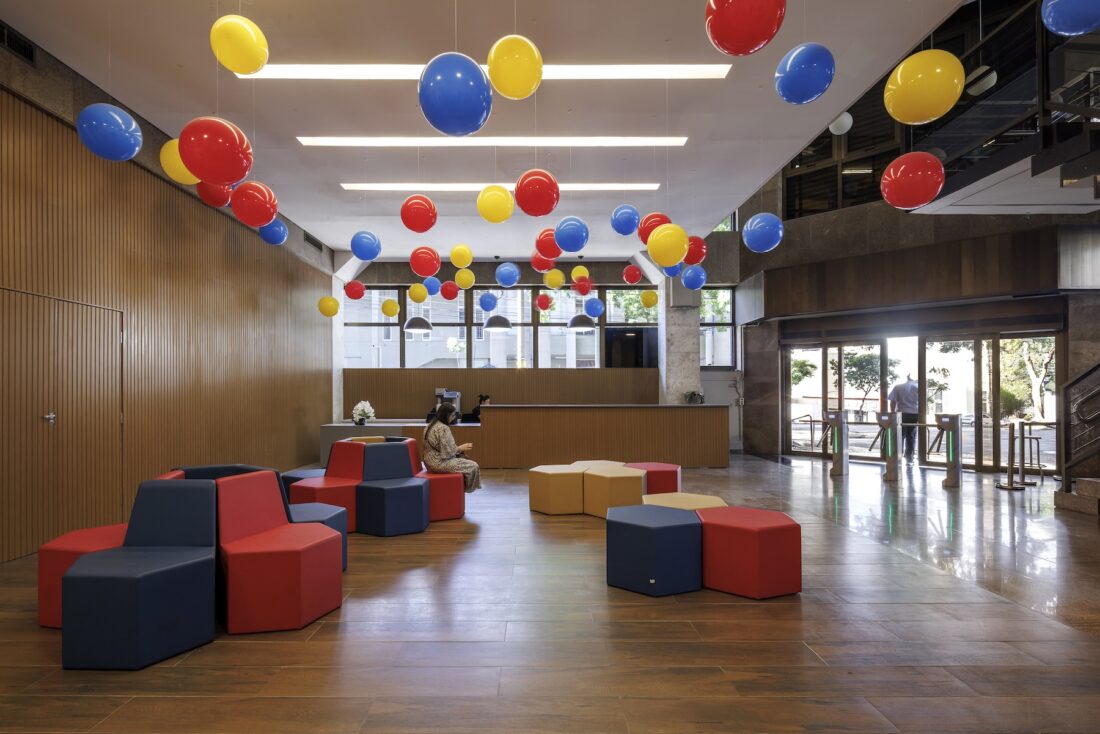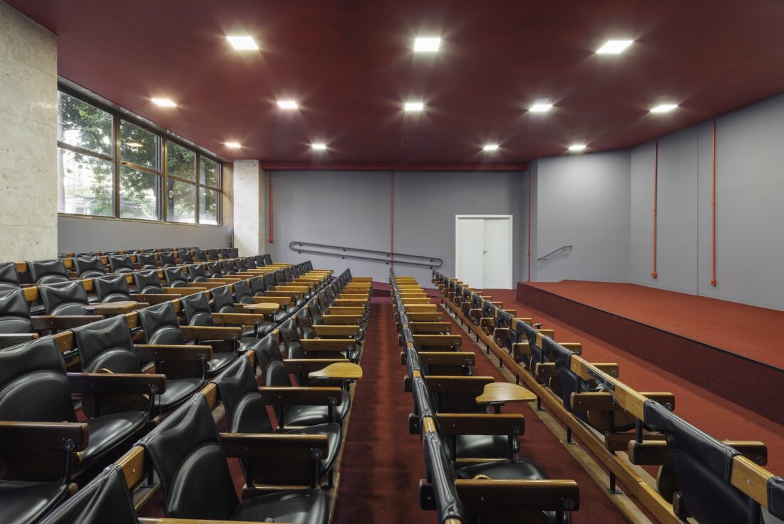 No auditório, as icônicas longarinas de Sérgio Rodrigues foram preservadas e restauradas. O espaço também recebeu melhorias nos acessos, além de inserção de cor (um novo carpete e pintura no teto), que conferem acolhimento e conforto acústico.