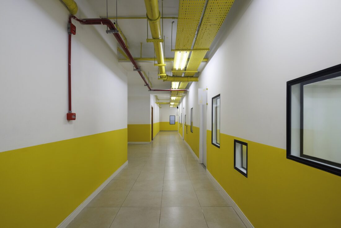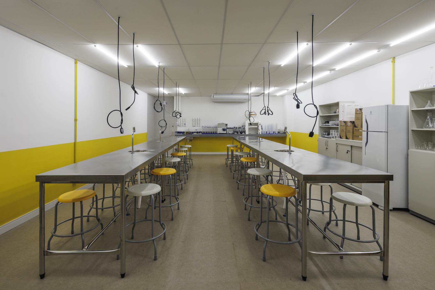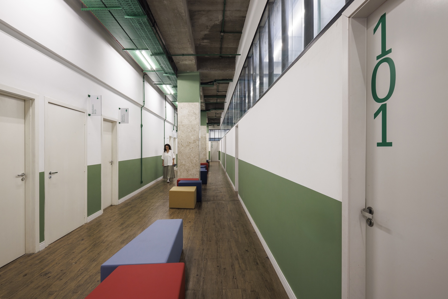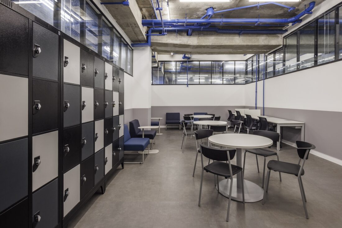 Para valorizar ao máximo a luz natural, foram instalados painéis de vidro fixos nas partes superiores das divisórias das salas de aula. Essa solução permite que a iluminação natural alcance os corredores e pátios internos, criando uma atmosfera agradável. O conforto acústico foi cuidadosamente planejado, com a instalação de forros acústicos e paredes duplas de gesso, garantindo ambientes ideais para o aprendizado. Cada pavimento recebeu uma cor distinta, aplicada tanto nas paredes quanto nas tubulações aparentes. Essa escolha reforça a identidade visual de cada andar e facilita a orientação de alunos e professores pelos espaços.