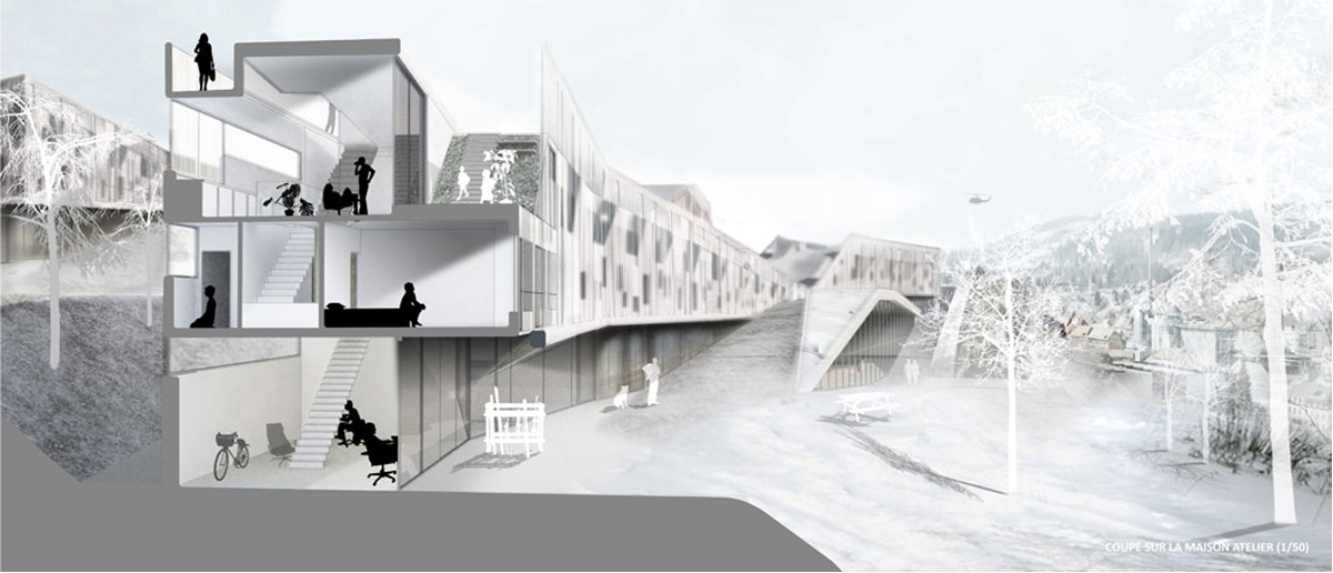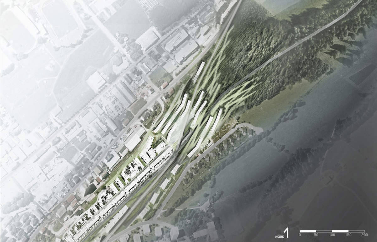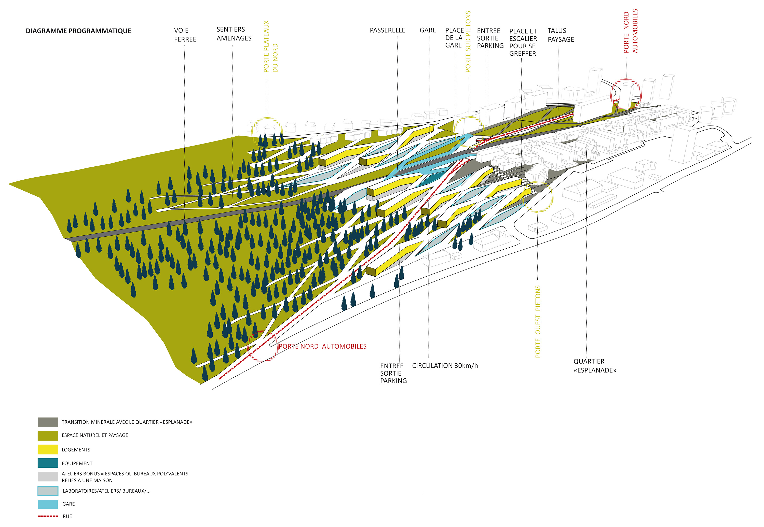 Essa trama porosa e sinuosa marca o fim do vale, a fronteira natural entre espaço urbano e paisagem. Ela oferece uma nova maneira de habitar e de trabalhar no coração de um bairro sustentável alternando aberturas sobre o horizonte et transições com diferentes gradações de intimidade. A articulação de diferentes usos é sugerida pela diversificação da malha deixada livre à transparência, à respiração, e à apropriação desse pedaço de cidade sustentável por seus habitantes no cotidiano.
