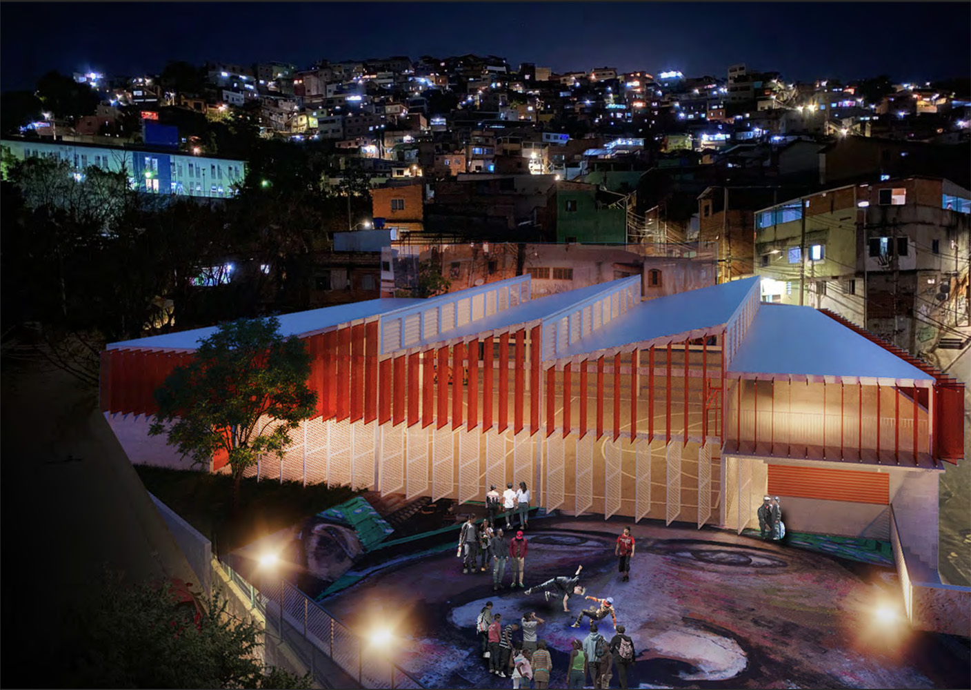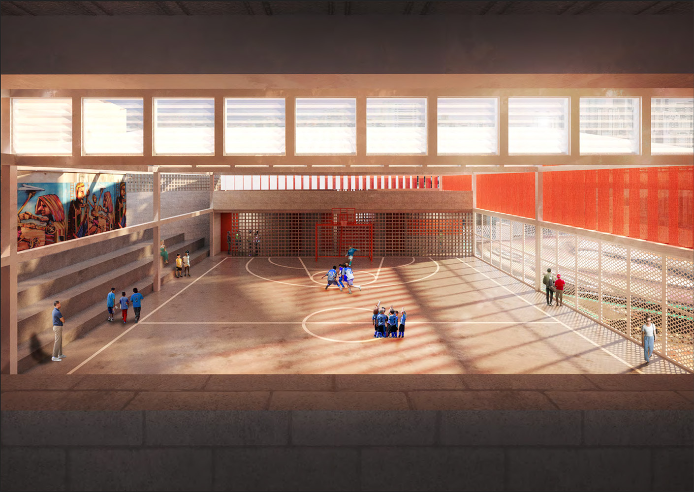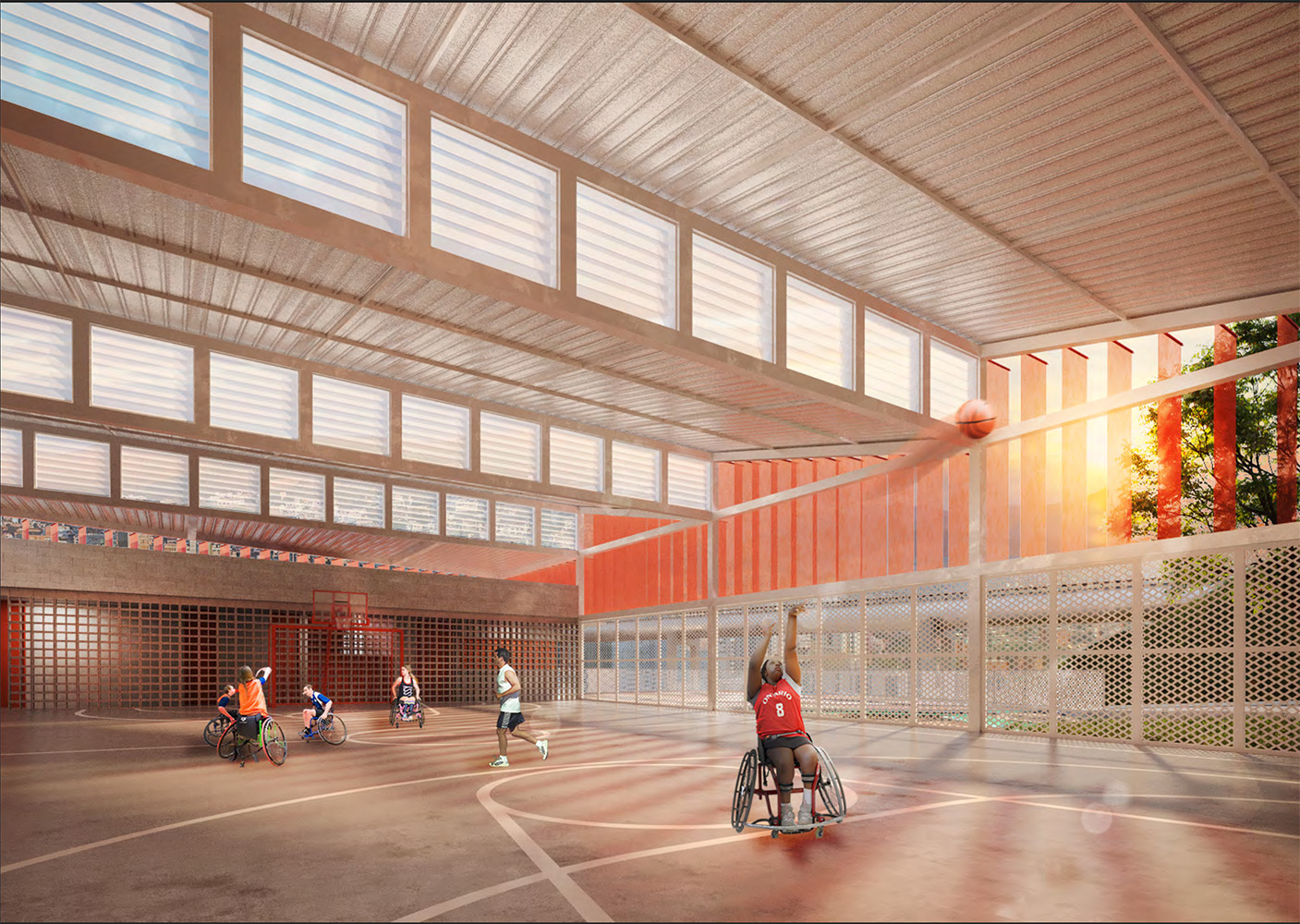 O programa de infraestrutura da quadra compõe dois blocos: à esquerda, estão localizados os banheiros, vestiários, depósito de material de limpeza e lavabos; e à direita, estão localizados os cômodos administrativos e uma cozinha para atender a demanda dos eventos. Sobre ambos os blocos, cria-se uma laje mais baixa em relação à cobertura metálica, que permite um segundo ponto de integração e plateia, para além da arquibancada existente.