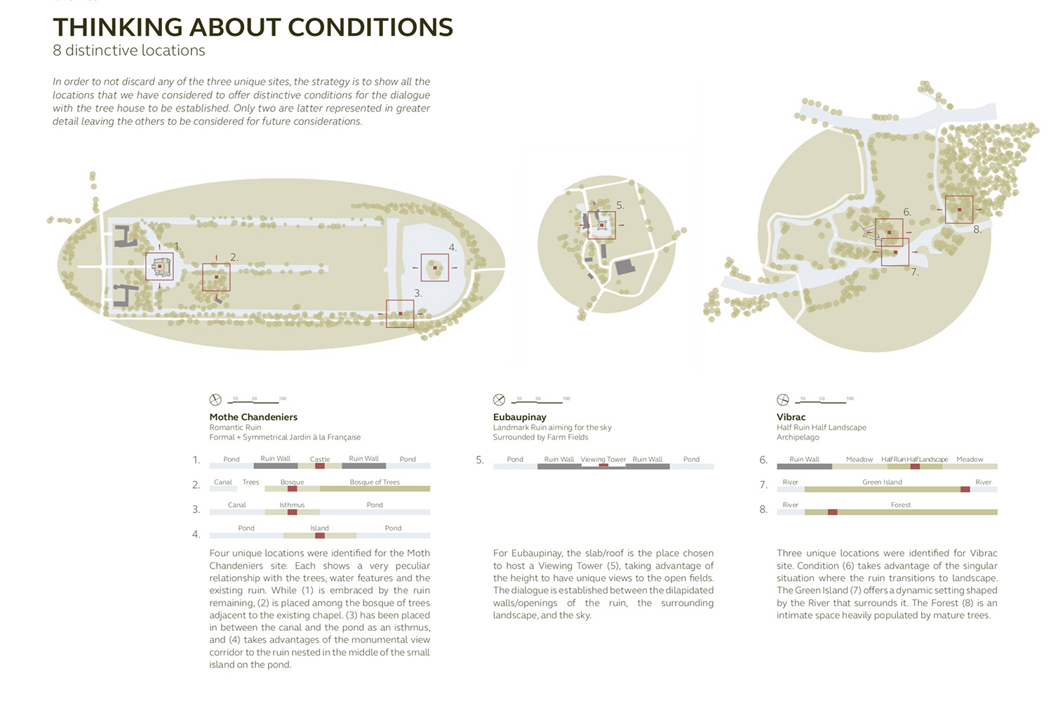 In order to not discard any of the three unique sites, the strategy is to show all the locations that we have considered to offer distinctive conditions for the dialogue with the tree house to be established. Only two are latter represented in greater detail leaving the others to be considered for future considerations.
