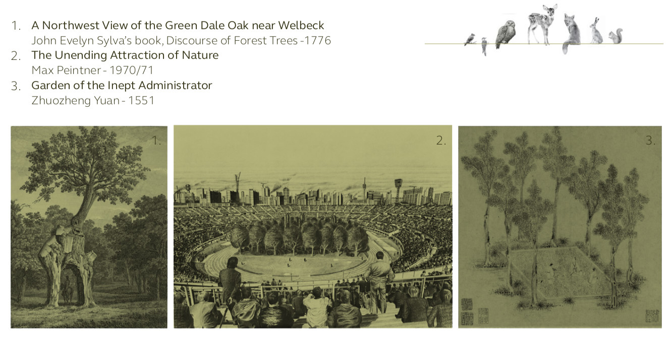 The space is composed not from matter but from dualities, an architecture constituted of distances. A space formed by ambiguous boundaries interpreting the connections and relationships assimilated by the trees and the landscape constituting them.